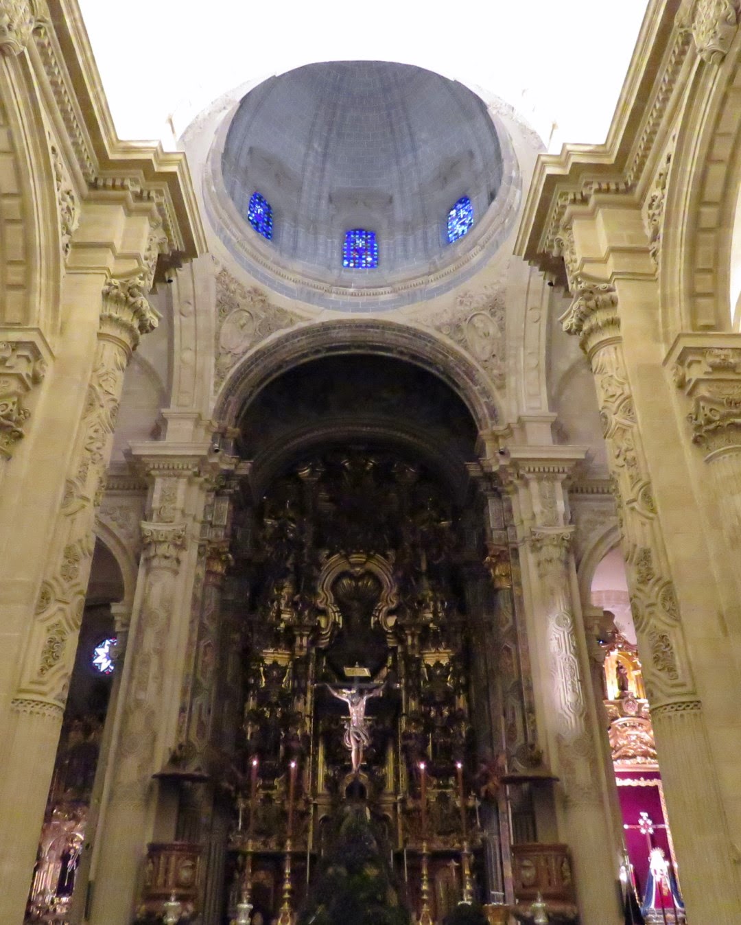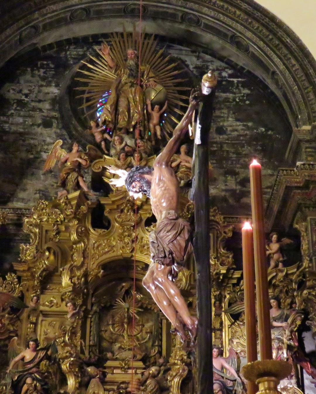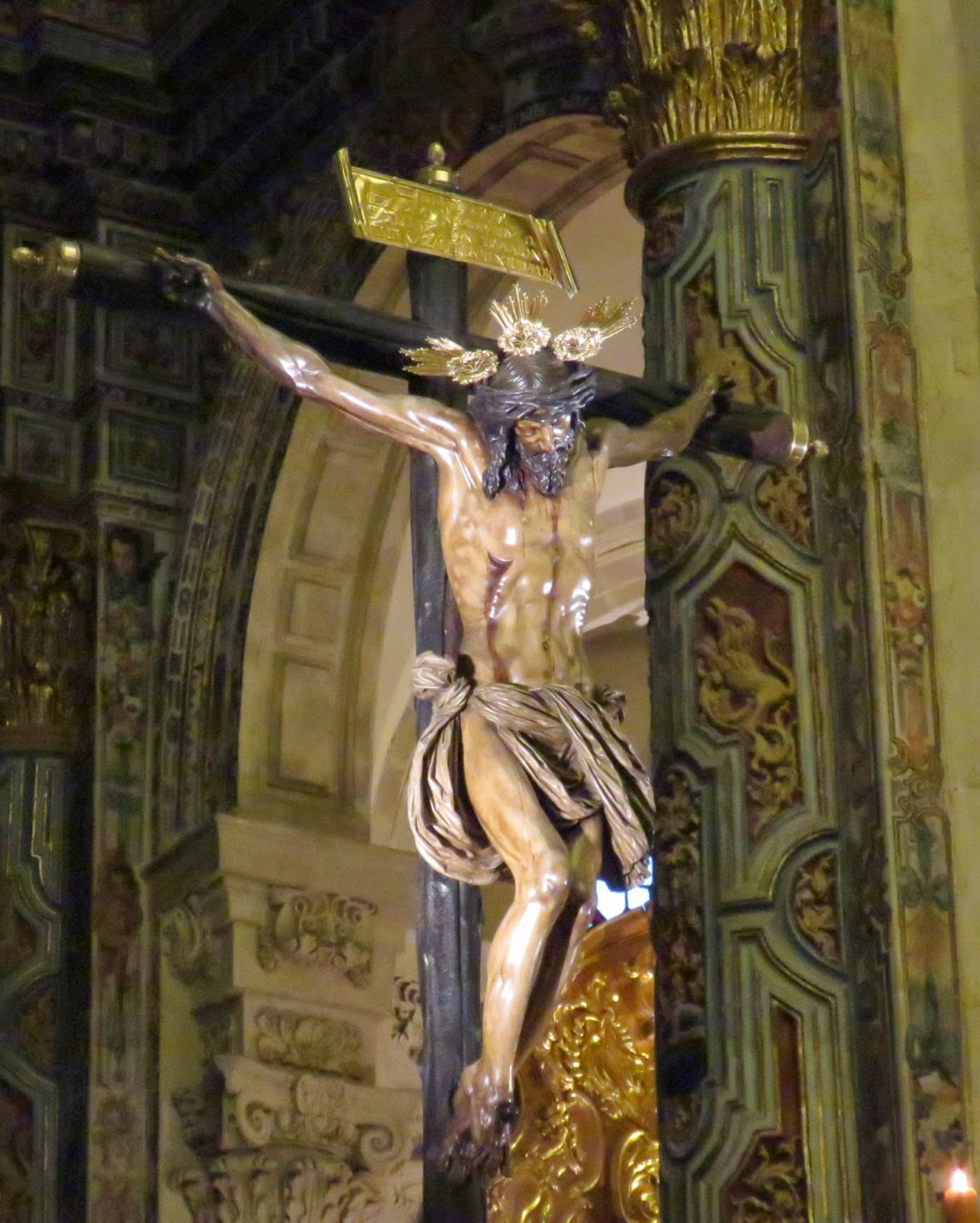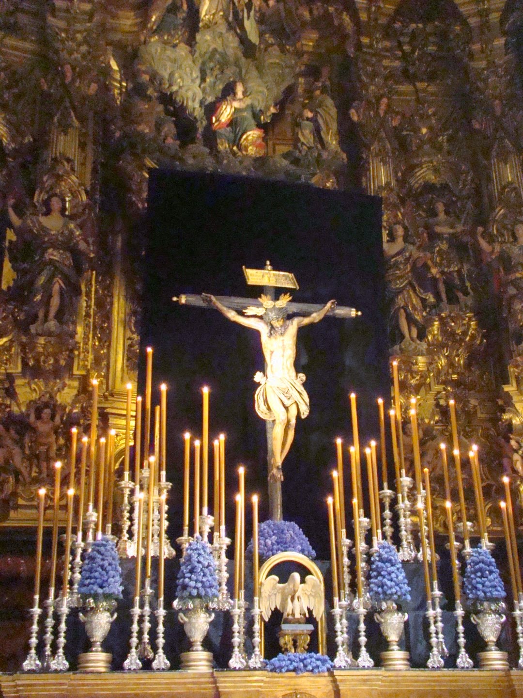 En estos días de cuaresma todas las hermandades de Sevilla celebran sus cultos principales, estamos acostumbrados a ver grandes altares de cultos llenos de candelerías y flores que en la oscuridad del templo nos cautivan por sus contraluces y claroscuros. En estos primeros días nos ha causado una grata sorpresa el instalado por la Hermandad del Amor para celebrar el quinario de su crucificado titular. Podríamos decir que la sencillez se ha unido a la genialidad, el altar es de lo más simple cuatro grandes hachones flanquean la imagen del crucificado que descansa sobre una pirámide con exorno vegetal, nada más simple , pero lo verdaderamente novedoso es el lugar que ocupa, en vez de estar en el presbiterio se ubica en el crucero de la iglesia colegial del Divino Salvador con lo que se consigue que sea un altar panorámico ya que puede contemplarse desde todos los ángulos de vista posibles y como telón de fondo tiene el incomparable marco de los retablos y la arquitectura del templo. Desconozco la opinión de los hermanos más tradicionales en estos menesteres pero desde luego para los amantes de la fotografía este altar es una gozada, se puede ver al Cristo desde todas las perspectivas posibles y siempre queda magnífico, como no podía ser menos siendo ésta una de las obras maestras de Juan de Mesa. También les mostramos una imagen del altar instalado en el año 2014 en el quinario para que comparen mejor las diferencias.