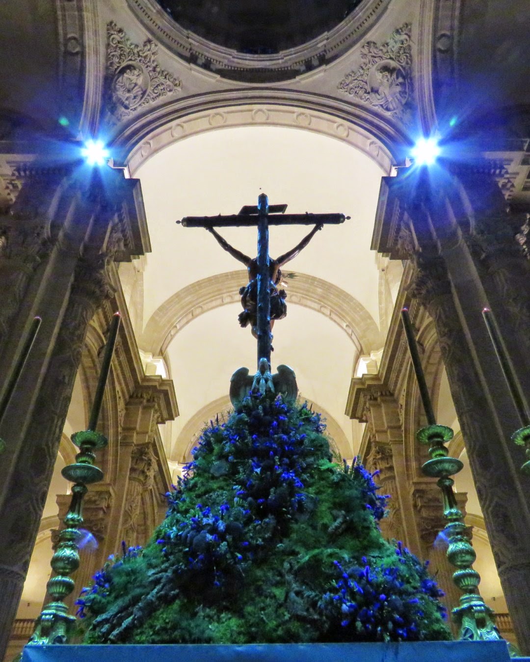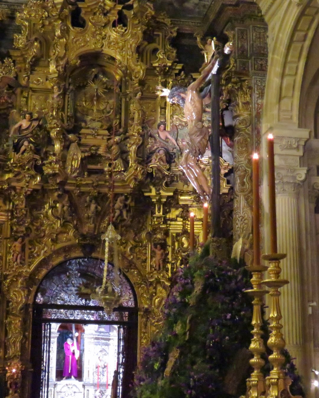 En estos días de cuaresma todas las hermandades de Sevilla celebran sus cultos principales, estamos acostumbrados a ver grandes altares de cultos llenos de candelerías y flores que en la oscuridad del templo nos cautivan por sus contraluces y claroscuros. En estos primeros días nos ha causado una grata sorpresa el instalado por la Hermandad del Amor para celebrar el quinario de su crucificado titular. Podríamos decir que la sencillez se ha unido a la genialidad, el altar es de lo más simple cuatro grandes hachones flanquean la imagen del crucificado que descansa sobre una pirámide con exorno vegetal, nada más simple , pero lo verdaderamente novedoso es el lugar que ocupa, en vez de estar en el presbiterio se ubica en el crucero de la iglesia colegial del Divino Salvador con lo que se consigue que sea un altar panorámico ya que puede contemplarse desde todos los ángulos de vista posibles y como telón de fondo tiene el incomparable marco de los retablos y la arquitectura del templo. Desconozco la opinión de los hermanos más tradicionales en estos menesteres pero desde luego para los amantes de la fotografía este altar es una gozada, se puede ver al Cristo desde todas las perspectivas posibles y siempre queda magnífico, como no podía ser menos siendo ésta una de las obras maestras de Juan de Mesa. También les mostramos una imagen del altar instalado en el año 2014 en el quinario para que comparen mejor las diferencias.