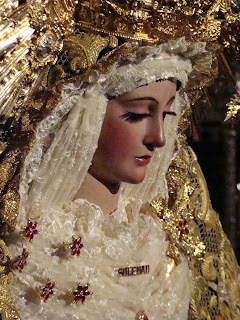 «La imagen de Nª Sª de la Soledad de la conocida popularmente como Hermandad de la Plaza de Castilleja de la Cuesta estuvo el pasado fin de semana de Besamanos. Pocas imágenes pueden presumir de tener la versatilidad que posee esta virgen, protagonista de las jornaditas, de su paso de palio y de su paso de gloria, así como de su rico patrimonio, auténticas obras de arte del bordado y de la orfebreria. El ajuar que lucia para tan solemne ocasión era el siguiente: Corona realizada por Fernando Marmolejo Camargo realizada en 1944 con diseño del afamado ceramista D. Juan Oliver Míguez, conocida por el apelativo de «La Grandiosa». Manto negro obra de las Hermanas Antúnez de finales del siglo XIX. Saya blanca obra de Ramón Caro y diseño de Juan Oliver Míguez de principios del siglo XX y la Toca de Sobremanto realizada por Bordados Salteras en 2003 con diseño de José Manuel azuaga Polo, propietario de dicho taller y vestidor de la Virgen. Todo un compendio de arte de nuestra manifestación religiosa por excelencia, la Semana Santa.»