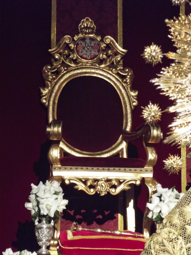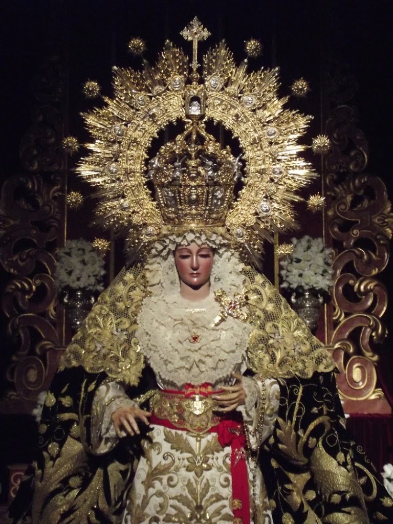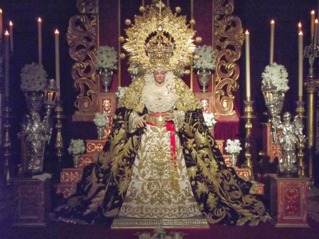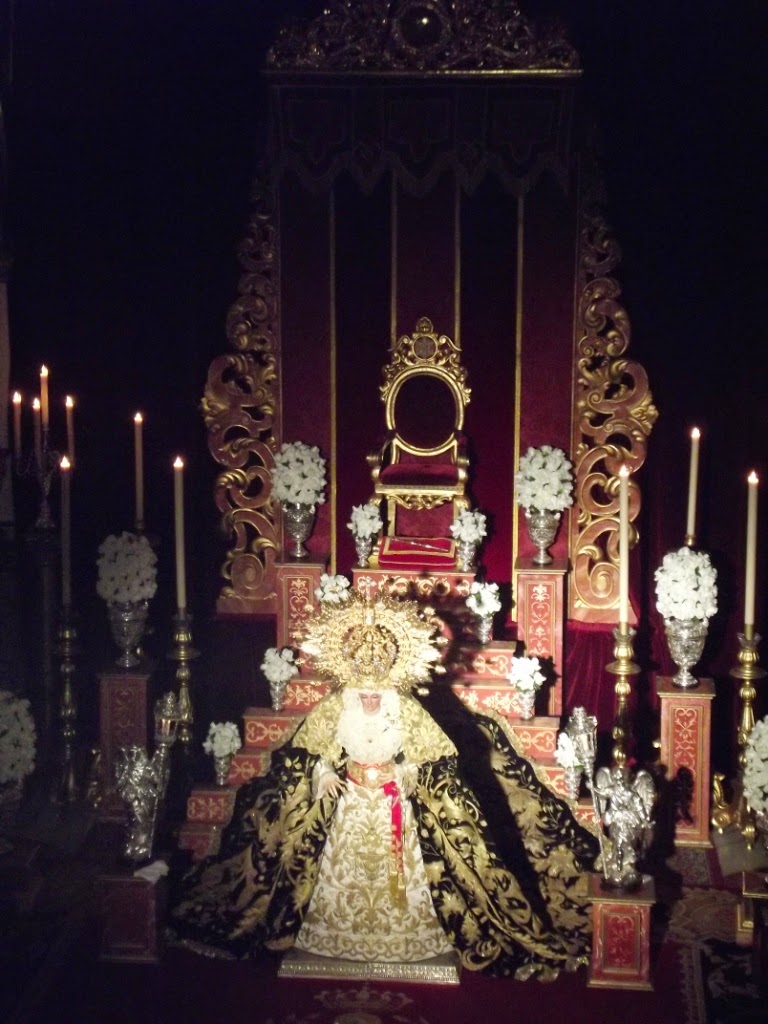 Ocupando el presbiterio de la parroquia de Santiago se dispuso un hermoso montaje con escalinata y trono (cedido por la Hermandad Sacramental de Tomares) y la Virgen en el centro con sus mejores galas.