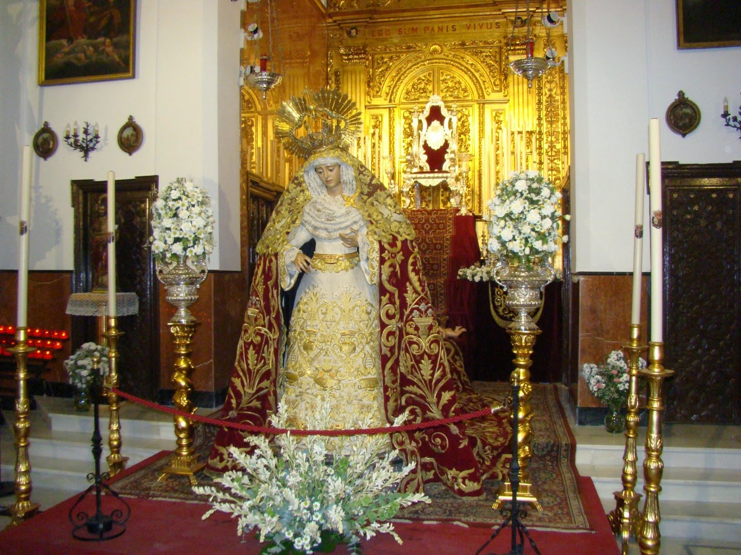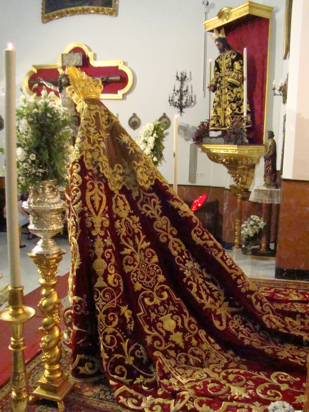 Durante el último fin de semana de octubre se ha celebrado en la capilla de San Andrés el anual besamanos a Mª. Santísima de Regla, dolorosa titular de la Hermandad de los Panaderos. Les ofrecemos imágenes del mismo, en el cual destaca el altar presidido por el trono de reina de la Hermandad de Santa Genoveva. La virgen lucia el antiguo manto de salida obra de Sobrinos de Caro en 1930, la saya blanca de la coronación obra de Mariano Martín Santonja en 2010, la corona de la coronación, obra de los Hermanos Delgado y la medalla de la ciudad.