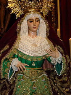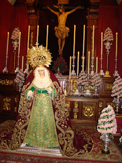 » Durante los días 15 y 16 de diciembre nuestra dolorosa titular, María Santísima de Guadalupe ha estado en devoto besamanos, Nuestra Virgen se encontraba este año de manera muy novedosa ya que lucia la recién estrenada saya torera, confeccionada por el bordador D.Antonio Jesús del Castillo a partir de un traje de luces de un subalterno de la cuadrilla del diestro recientemente fallecido D.Diego Puerta, junto con un manto de camarín rojo burdeos cedido para la ocasión por la Hermandad de la Esperanza de Triana. En el altar también habia un par de jarras cedidas por la Hermandad de la Carreteria, todo ello perfectamente conjuntado con el exorno floral de rosas.»