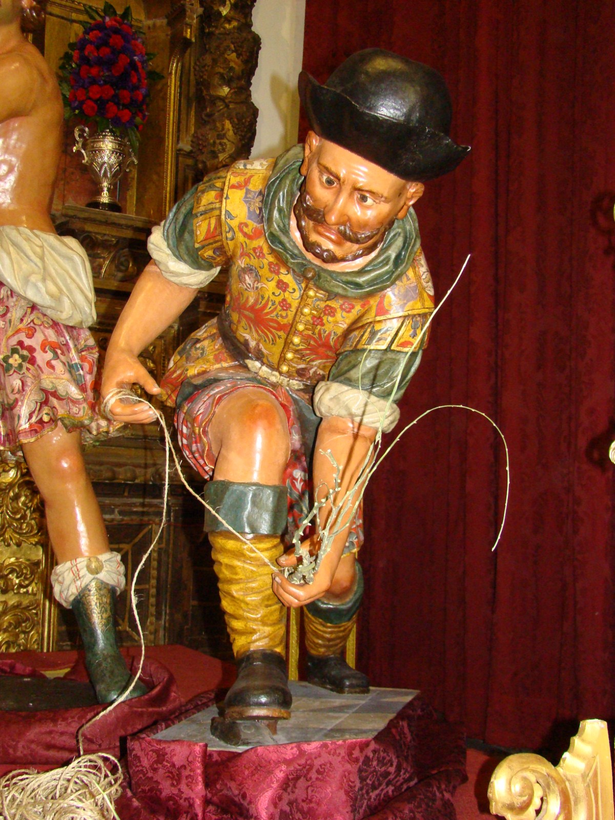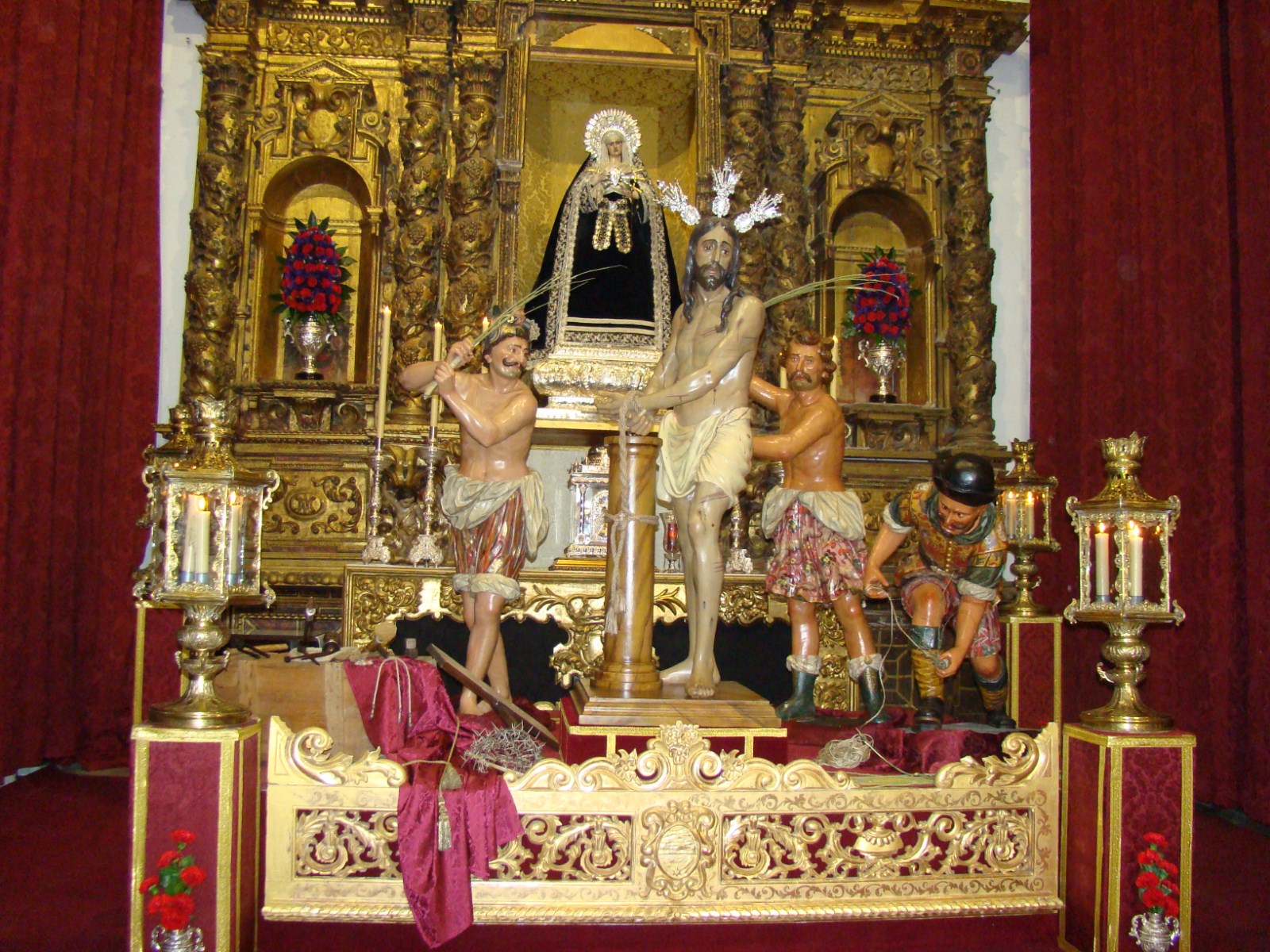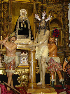 Iniciamos esta serie con uno de los más destacados y sin duda el más «sevillano», se trata del realizado por la Hermandad Servita en la iglesia de la Santísima Trinidad. El cristo de las Misericordias que procesiona el miércoles santo aparecia acompañado por las imágenes secundarias del misterio de su paso para escenificar la flagelación. Hacer mención que éstas figuras son las que en su día procesionaban en Sevilla en el paso de la Hermandad de las Cigarreras, son los conocidos popularmente por el «mellao», el «verrugas» y el «tio de los esparragos».