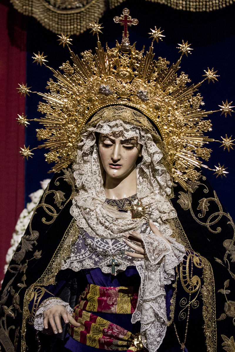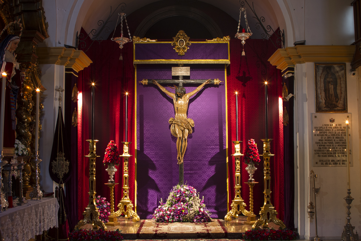 Este año se disponia el mismo dividido en dos partes, el del Cristo flanqueado por cuatro blandones cedidos por la Hermandad de San Roque y el de la Virgen que lucía la diadema y el manto de salida del Lunes santo, de fondo el frontal del antiguo palio junto a los dos antiguos candelabros de cola del paso de Nª. Sª. de los Ángeles, cedidos por la Hermandad de Los Negritos.