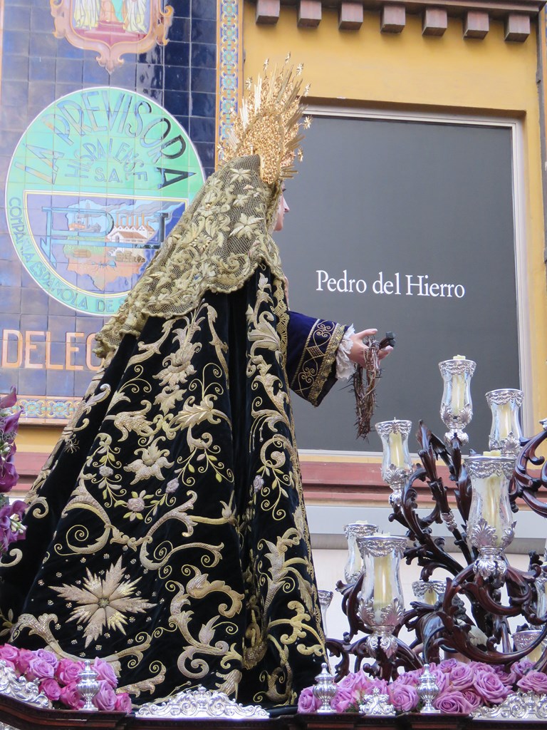 Las procesiones de Semana Santa y el discurrir de los diferentes pasos por las calles de la ciudad a veces nos proporciona imágenes curiosas e inéditas gracias al trasfondo urbanístico: anuncios , carteles , vallas publicitarias y mobiliario urbano . Les mostramos algunos ejemplos de ello y esperamos su comprensión porque nada más lejos de querer banalizar nuestra semana mayor, al contrario es mostrar un aspecto más de lo que puede dar de si y que escapa a la vista, pero no al objetivo de una cámara fotográfica. La Soledad de San Buenaventura a su paso por la calle Tetuán.