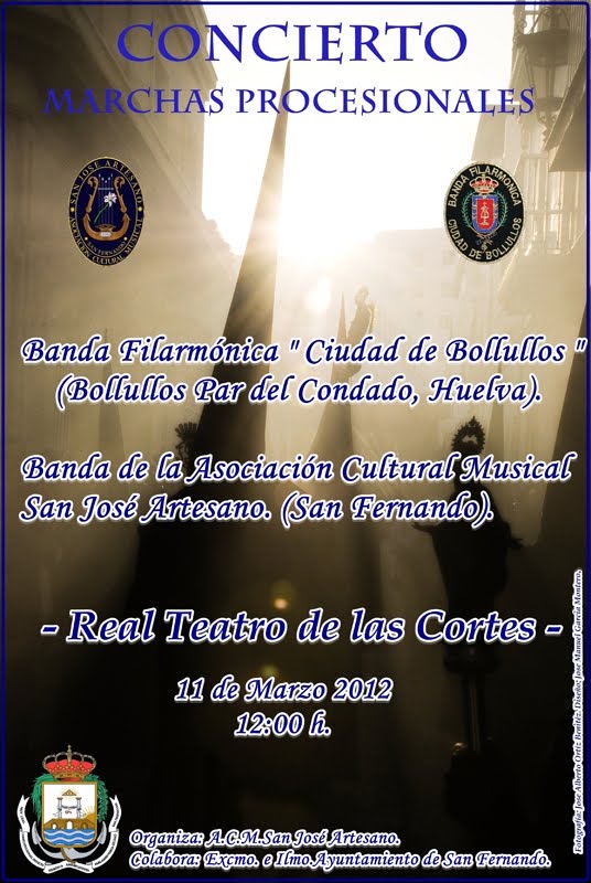 El próximo domingo 11 de Marzo a las 12 de la mañana en el Real Teatro de las Cortes de San Fernando participara la Banda Filarmónica «Ciudad de Bollullos» de Bollullos Par del Condado (Huelva), en un interesante concierto junto a la Banda de la Asociación Cultural Musical San José Artesano de San Fernando (Cádiz).
