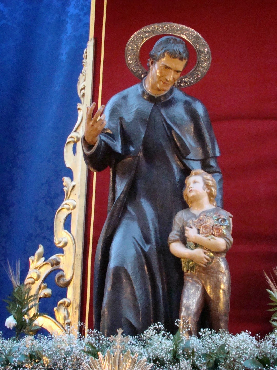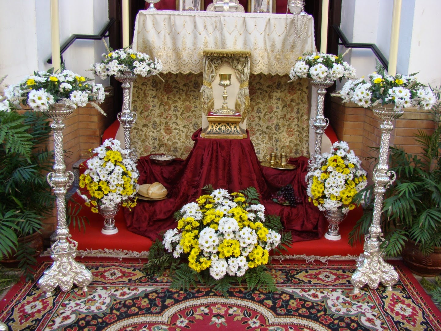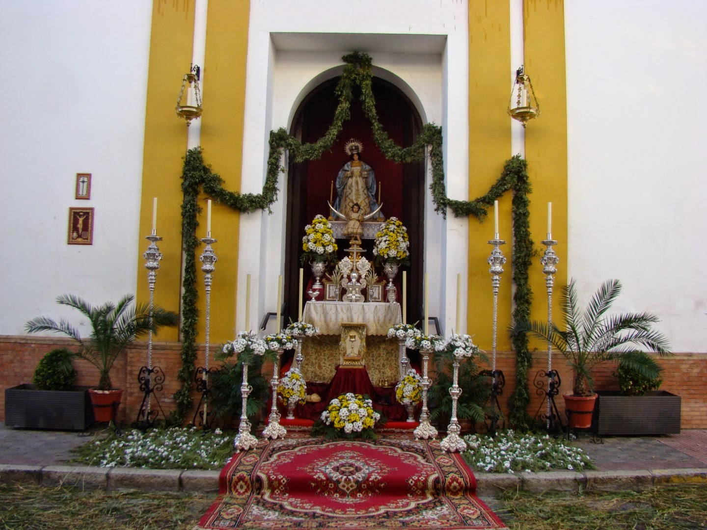 Hermandad del Rosario, Residencia de ancianos “La Milagrosa”. El altar que se llevó el primer premio en el concurso estaba dedicado a la Coronación Canónica de María Auxiliadora y al Centenario de la Casa Salesiana de Alcalá (1914-2014) en la que radica la Hermandad. La zona superior era una alegoría de la coronación de la Virgen, con la imagen de María Auxiliadora sin corona con el Niño en brazos, sobre la que aparecía un gran cortinaje rematado con la corona simbólica de la Coronación Canónica. En la zona inferior bajo el dosel de madera tallada y terciopelo rojo que posee la Hermandad aparecía la imagen de San Juan Bosco, que además es Titular de la Hermandad salesiana. Ante él, una consola de madera tallada y dorada con la custodia de sol de la Casa Salesiana y otros elementos litúrgicos como cáliz, copón, vinajeras, palia, etc. El resto del conjunto se completaba con jarras del paso de palio, bandejas de plata con escenas alusivas a la Santa Cena y a las bodas de Caná, ciriales, candeleros… todo ello adornado con varios tipo de flores blancas, y espigas de trigo con racimos de uvas procedentes de las Bodegas Góngora de Villanueva del Ariscal, que son las mismas que exornan la custodia de Arfe en el Corpus sevillano.