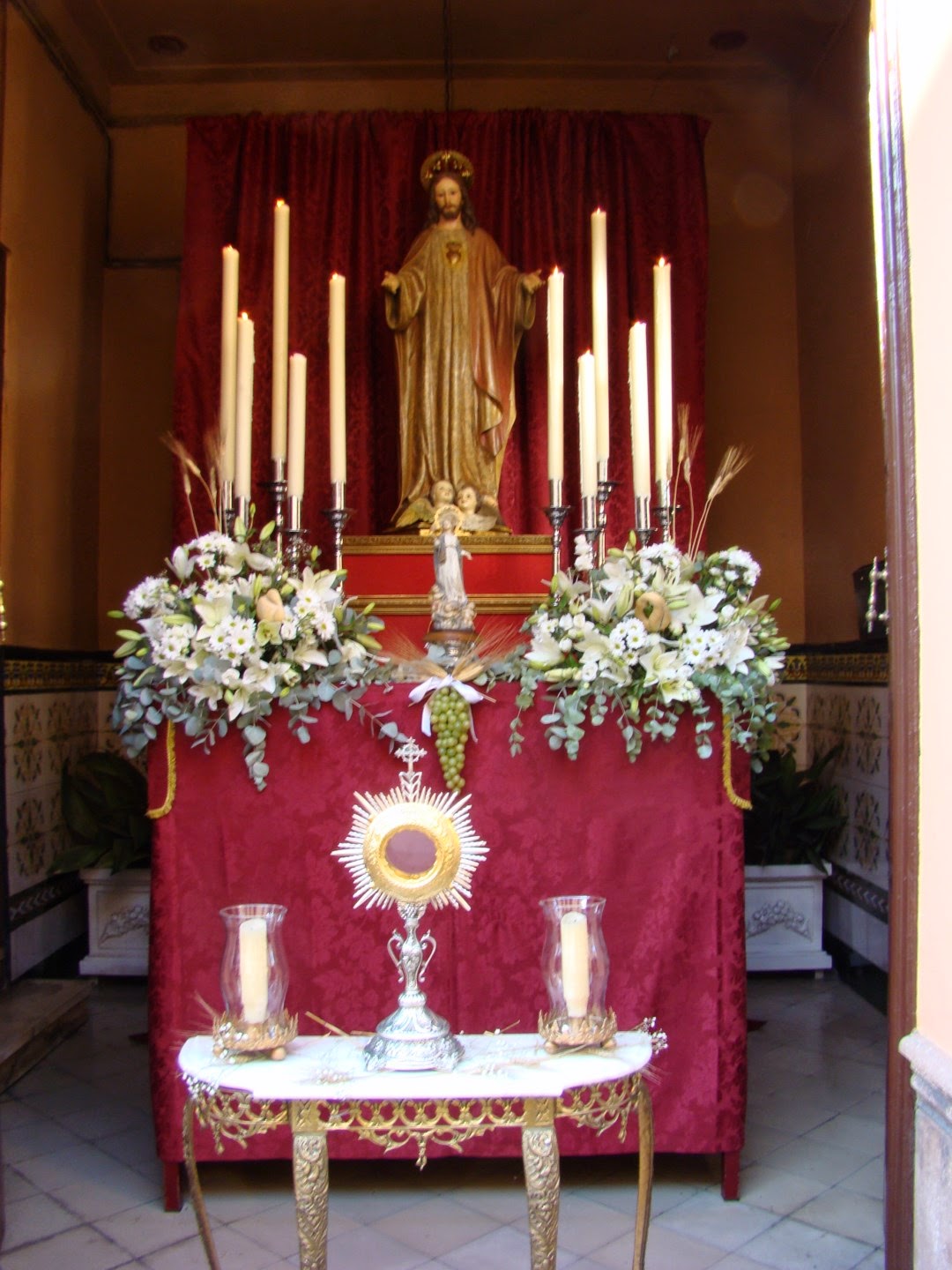 Hermandad de San Mateo, calle Herrero. En el zaguán de un domicilio particular aparecía el altar a modo de paso de andas con la imagen del Sagrado Corazón de la parroquia de Santiago rodeado de flores y velas. Ante el paso una pequeña mesa con la custodia, y los balcones de la casa se decoraban con flores, colgaduras y banderines de la Hermandad del Patrón.
