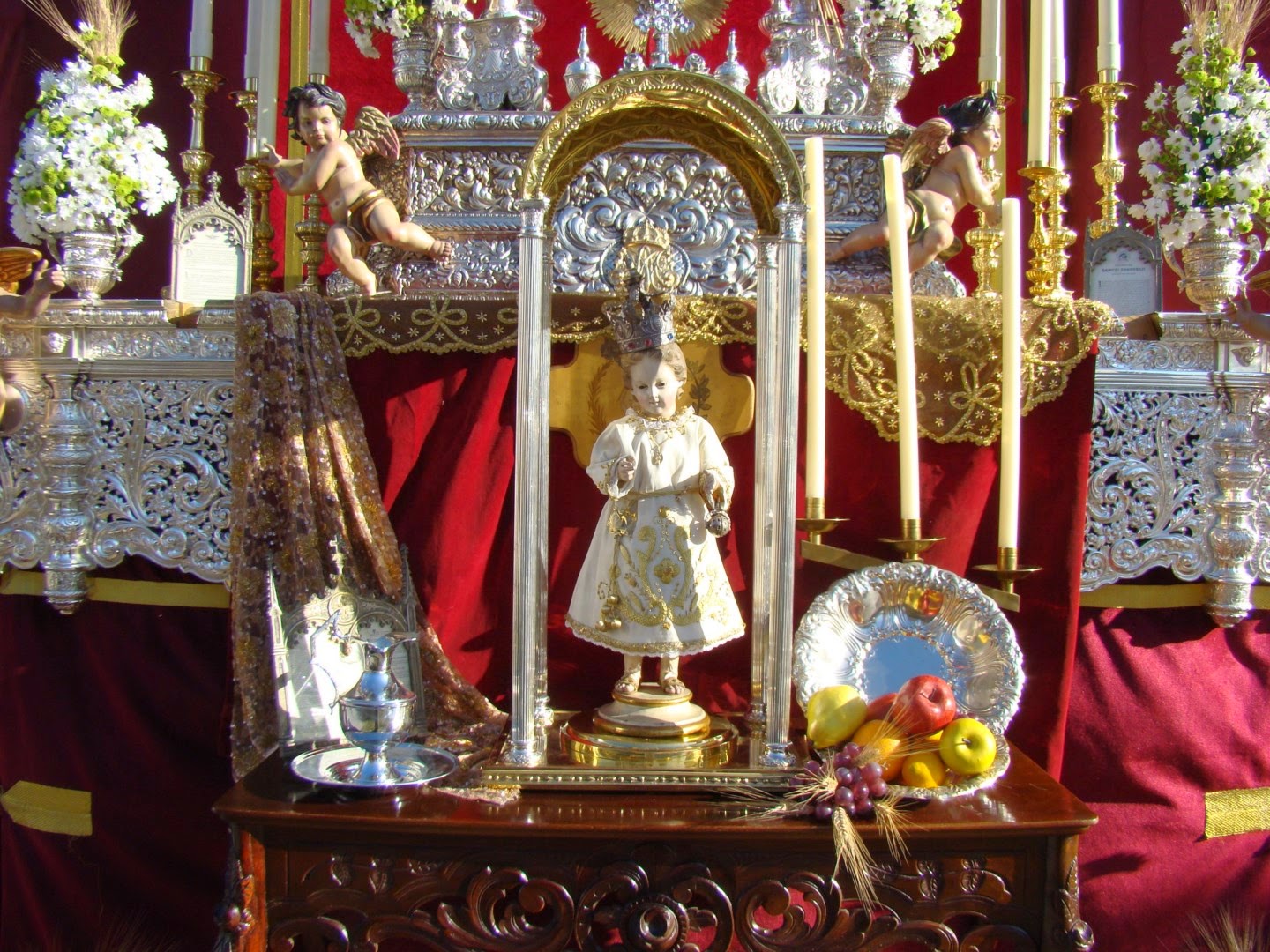 Hermandad de la Borriquita, Plaza del Derribo. Bajo un dosel rojo con rica bambalina bordada, aparece la imaginativa creación de una custodia de asiento a partir de las piezas de la candelería del paso de palio, además de otros enseres como la peana o los respiraderos de plata de Orfebrería Triana. En el primer cuerpo aparece una custodia de sol, en el segundo la Virgen del Águila, representada con la imagen del entrecalle del paso de palio, en el tercer cuerpo una imagen del patrón de Alcalá, San Mateo. Ante el conjunto aparece una consola de caoba con un templete que lleva un niño Jesús del siglo XIX, y otros elementos como bandejas de plata, flores, frutas..