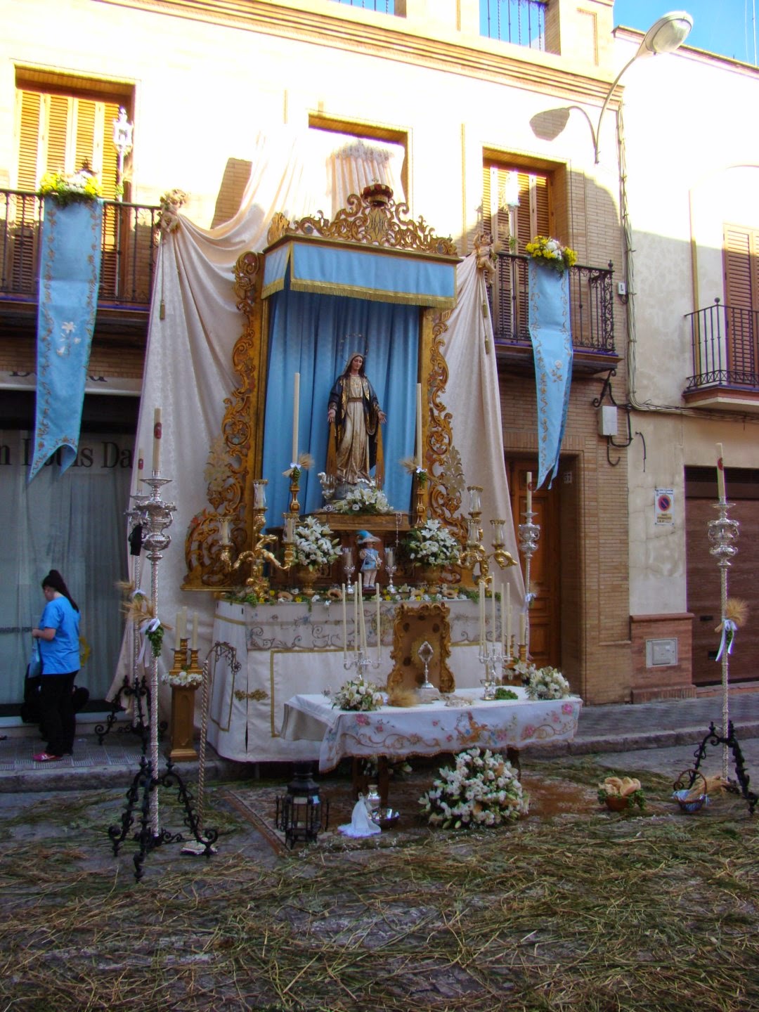 Hermandad del Dulce Nombre, calle Ntra. Sra. del Águila. Ante un domicilio particular se levantaba este altar presidido por la imagen titular de la Residencia “La Milagrosa”, que aparecía bajo el dosel de la Hermandad, decorado con paños blancos y celestes, candelabros de guardabrisas y flores. Ante el conjunto, aparecía una mesa de altar con manifestador, custodia y candelabros.