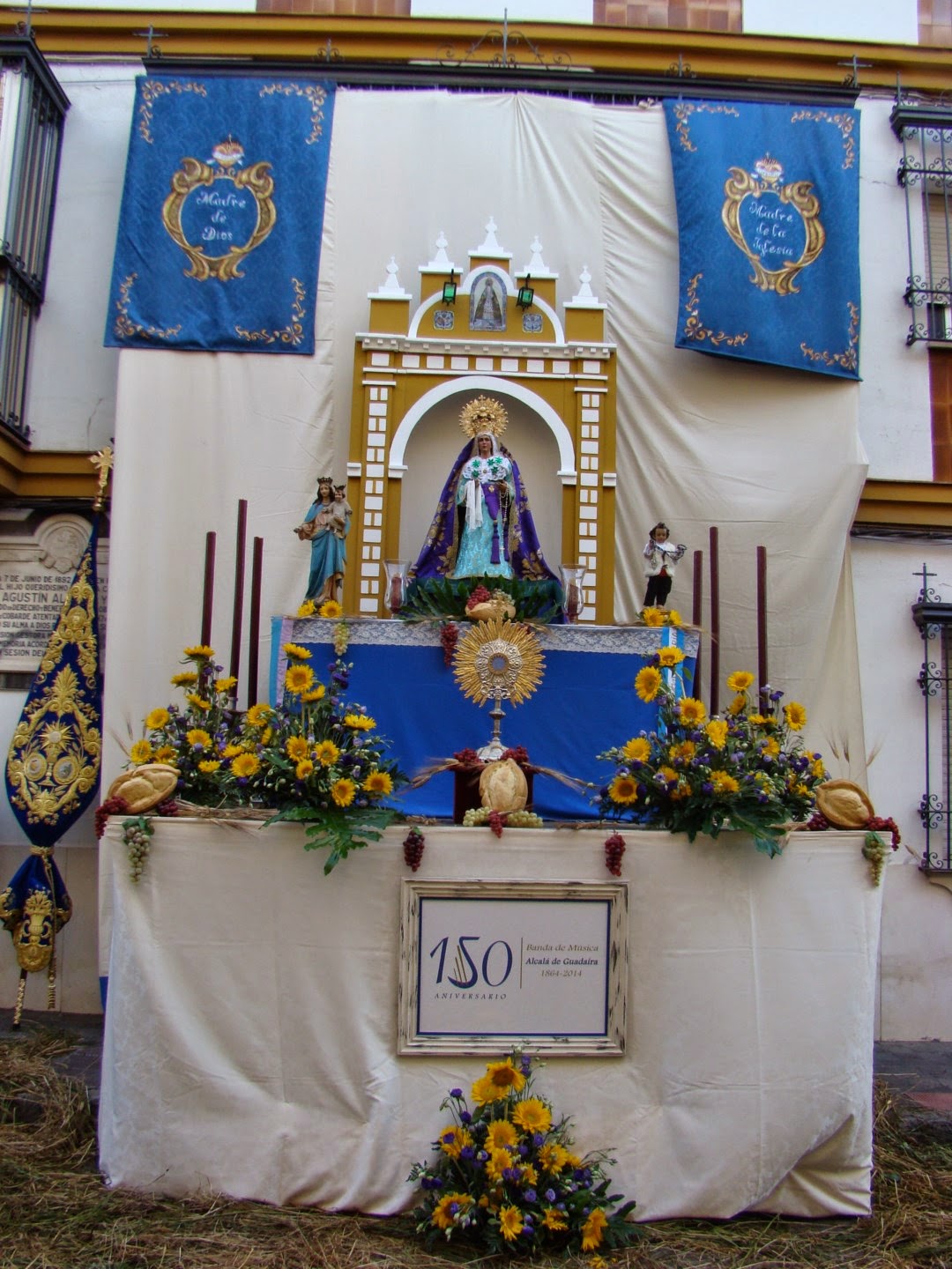 Hermandad Sacramental del Soberano, Residencia de monjas mayores, antiguo parvulario de las Hijas de la Caridad, calle NTra. Sra. del Águila. El altar estaba entonado en los colores corporativos de la Hermandad, blanco y celeste, y era un homenaje a los aniversarios y conmemoraciones que se han dado este año. En el centro, una reproducción del Arco de la Macarena y una copia de la imagen sevillana de pequeño tamaño, al cumplirse el Cincuentenario de la Coronación de la Esperanza, cuya Hermandad es madrina de la Corporación alcalareña. A un lado, María Auxiliadora con motivo de su Coronación en Alcalá el pasado 3 de mayo, y al opuesto un Niño Jesús ataviado como pastorcillo al cumplirse el 25 aniversario del nuevo Simpecado de la Hermandad rociera alcalareña. En el centro, la custodia de sol de la Parroquia de San Mateo, sede de la Hermandad del Soberano, adornada con pan, espigas y uvas. Completaban el altar candeleros con cera roja y un curioso exorno floral compuesto por girasoles y otras flores silvestres. En la zona inferior un cuadro recordaba el 150 aniversario de la banda de música “Ntra. Sra. del Águila”, con el logotipo conmemorativo.
