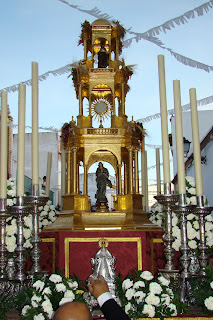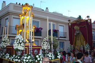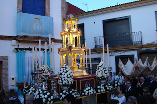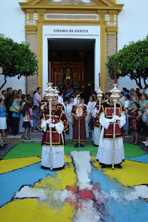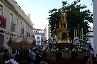 » Desde la parroquia de Santa María de Gracia sobre las 20,30 horas del sábado parte la procesión del Corpus de Camas. El cortejo lo abre el guión sacramental acompañado por los niños que han recibido la primera comunión, unas andas con la imagen del Niño Jesús y a continuación el paso de la Inmaculada y el del Sagrado Corazón. En último lugar van las representaciones de las Hermandades de la localidad así como las autoridades que figuran delante del paso de la Custodia. Se da la circunstancia de que éste posee iluminación eléctrica, como fácilmente puede apreciarse en las imágenes.El acompañamiento musical en esta ocasión fue de la Banda Virgen de las Angustias de Sanlucar la Mayor.»
