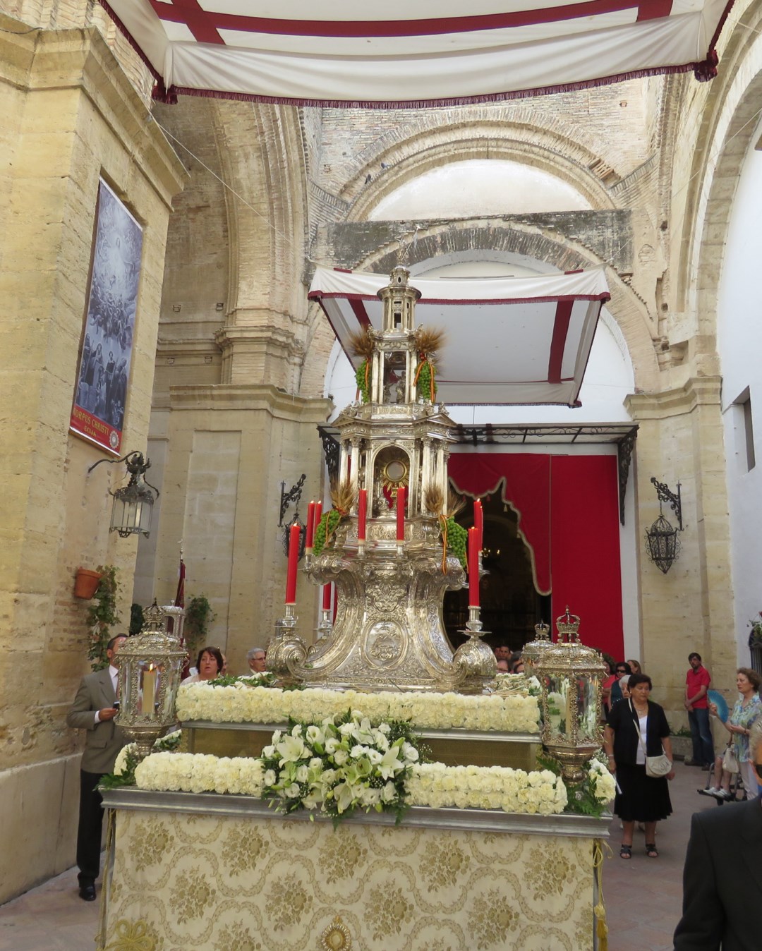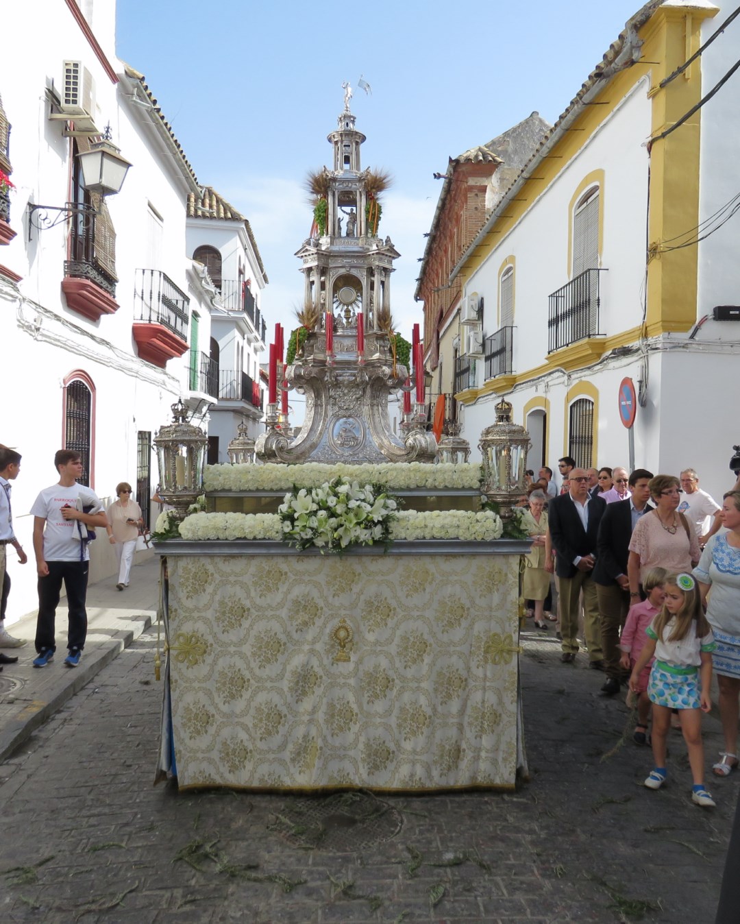 También las calles estuvieron embellecidas con otros altares colocados por particulares en las fachadas y zaguanes de sus domicilios, así como otras entidades religiosas. La procesión partió de la Iglesia Mayor de Santa Cruz sobre las nueve y treinta de la mañana. Detrás de la cruz parroquial que abría el cortejo, iban las representaciones de todas las Hermandades y Cofradías de la localidad, así como de las autoridades civiles y religiosas. La comitiva consta de un solo paso donde procesiona la magnífica custodia de plata, obra del insigne orfebre Francisco de Alfaro en 1586. La peana sobre la que se asienta la custodia es obra posterior del orfebre Cárdenas hacia el año 1800. El acompañamiento musical lo realizó la Banda de Música AMUECI ( Asociación Musical Ecijana).