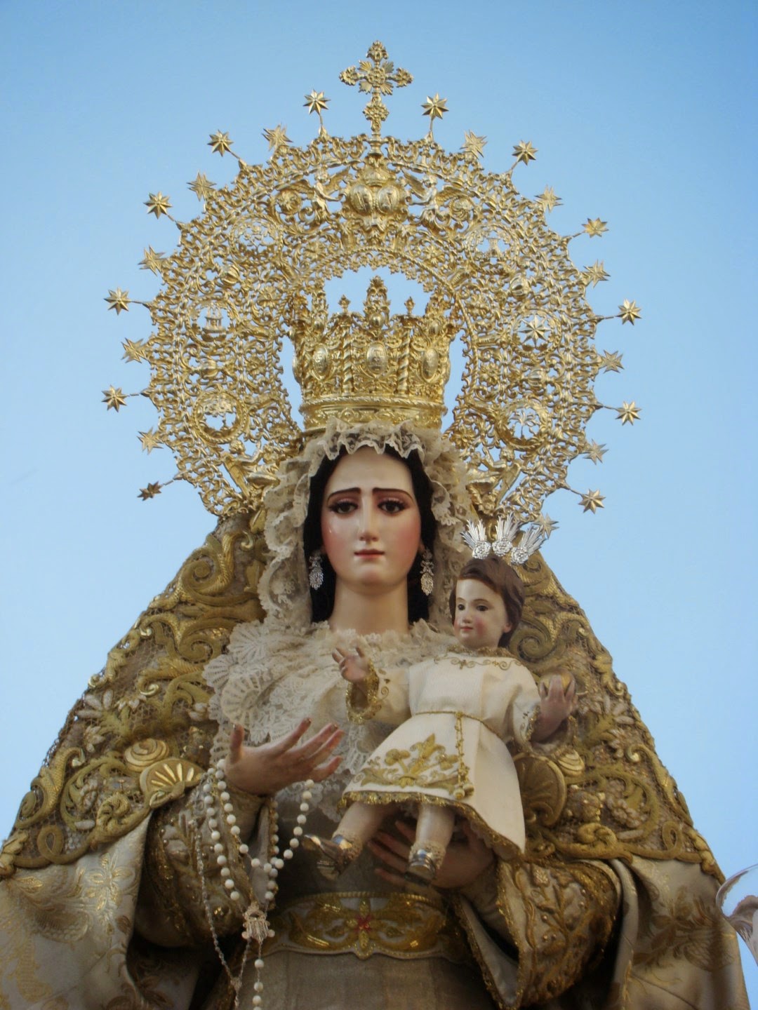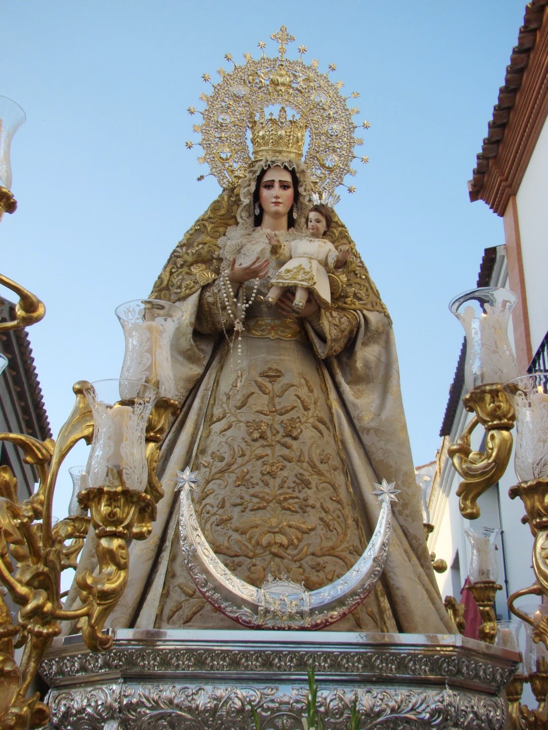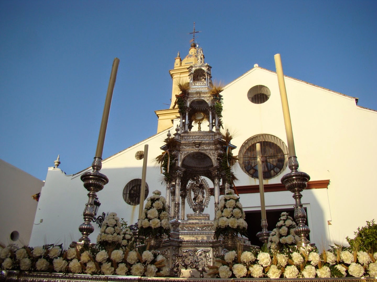 El jueves de Corpus por la tarde se realiza en la localidad sevillana de Olivares la anual procesión en honor de Jesús Sacramentado. La comitiva sale desde la antigua Colegiata de Mª Santísima de las Nieves hoy iglesia parroquial y recorre las calles cercanas a la misma. En su cortejo figuran las representaciones de las diversas hermandades de la población, Veracruz, Soledad y del Rocío. La procesión consta de dos pasos, en primer lugar va el de Nª. Sª. de la Antigua, obra del escultor Gabriel de Astorga, es titular de la Hermandad de la Veracruz que sale de forma gloriosa en esta ocasión pues en semana santa lo hace como dolorosa, iba acompañada musicalmente por la Banda de Nª Sª de la Oliva de Salteras y en segundo lugar figura el paso con la custodia de plata de más de dos metros de altura, aunque es obra moderna en su interior figura una Virgen de las Nieves en plata que es del siglo XVII. Iba acompañada musicalmente por la Banda local de Nª. Sª. de las Nieves.