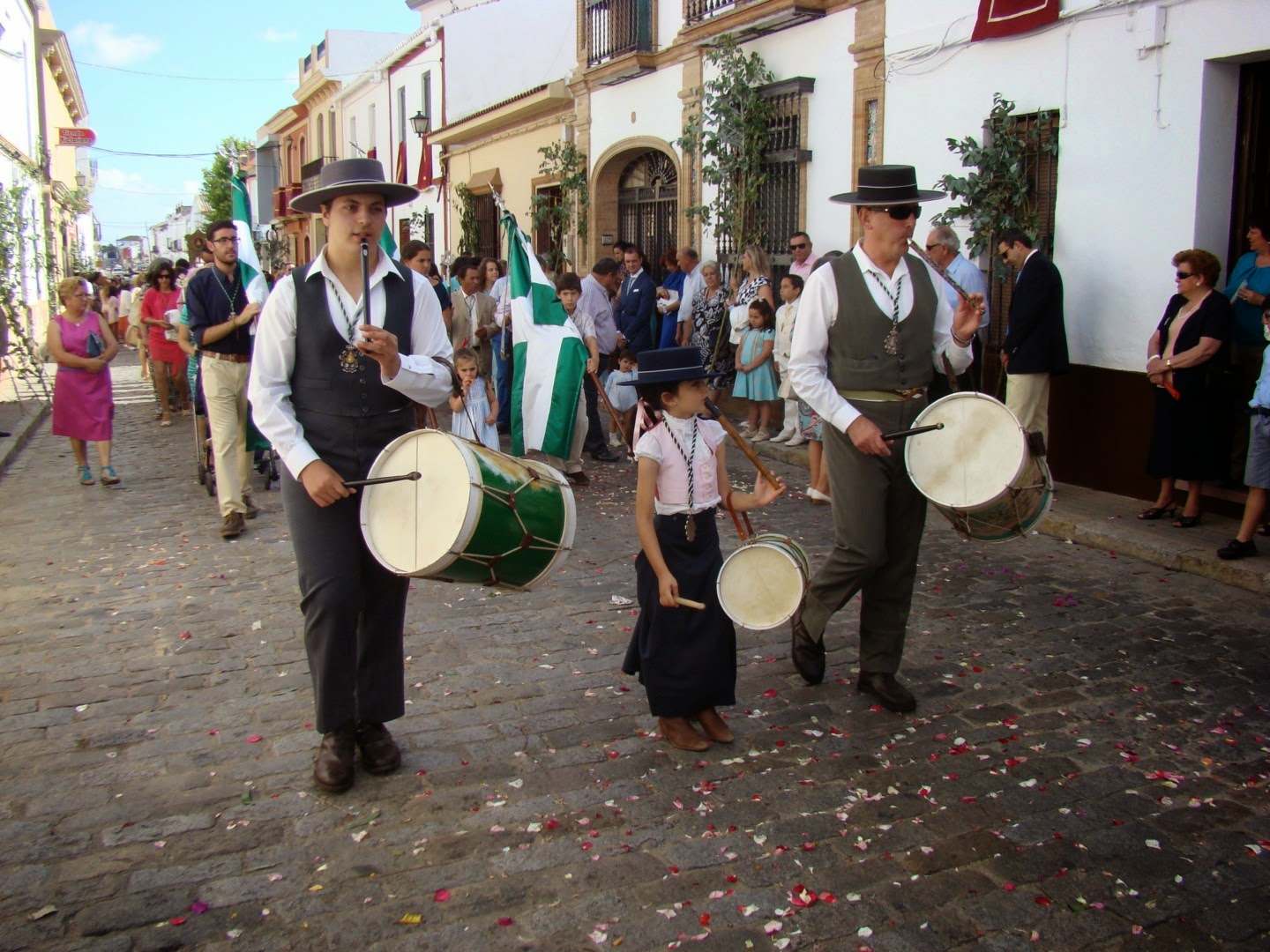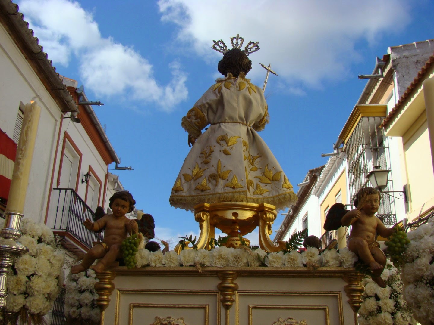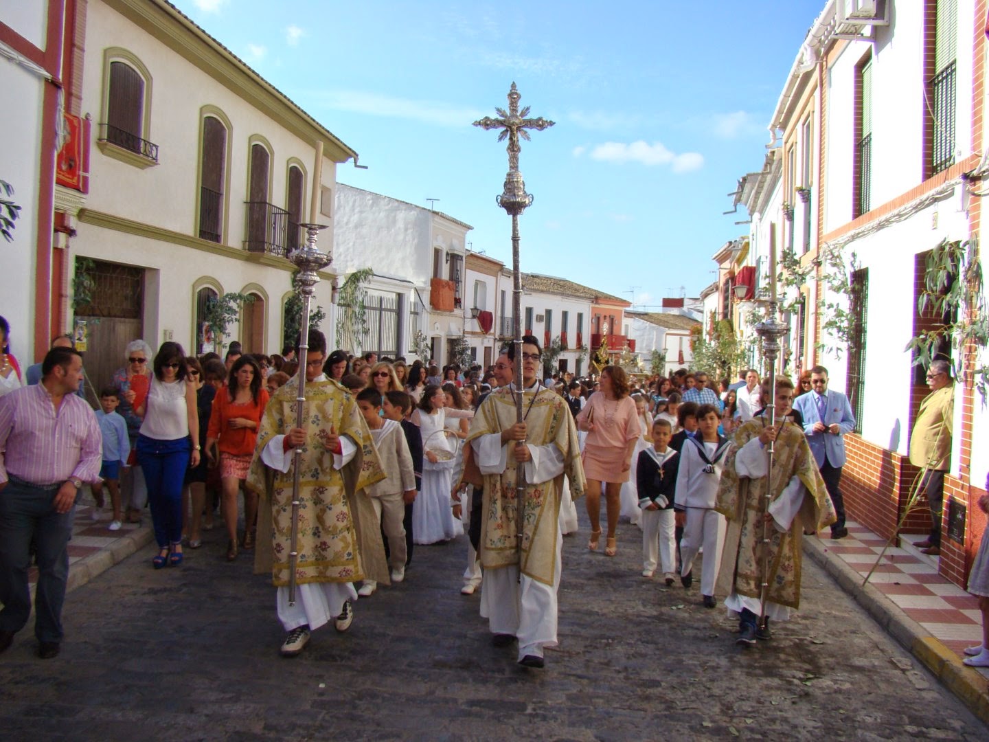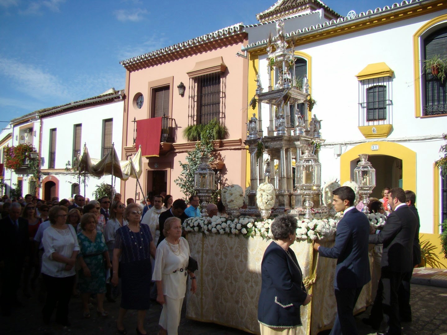 En la mañana del domingo de Corpus en la localidad sevillana de Pilas se realiza la anual procesión del Corpus Christi. Desde la iglesia parroquial de Santa María la Mayor parte la misma a recorrer las principales calles de la población. La comitiva consta de tres pasos, en primer lugar la imagen del Dulce Nombre de Jesús, conocida en Pilas como “Niño Dios de las Carreritas”, obra atribuida al círculo de Martínez Montañés de principios del siglo XVII, a continuación figura el paso con la imagen de la Inmaculada, una obra anónima del siglo XVII y en tercer lugar el paso de la custodia, que es una notable pieza de orfebrería realizada en 1858 en los talleres sevillanos de Doña Cristina Ysaura. La custodia presenta tres cuerpos con columnas toscanas y esculturas de los evangelistas, padres de la iglesia, San Juan Bautista, Inmaculada y se remata con una alegoría de la Fe. En el cortejo también iban representadas todas las Hermandades y Cofradías de la localidad con sus estandartes correspondientes.