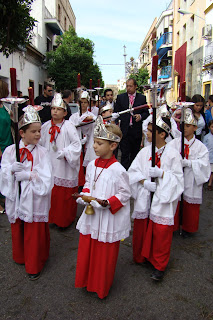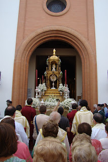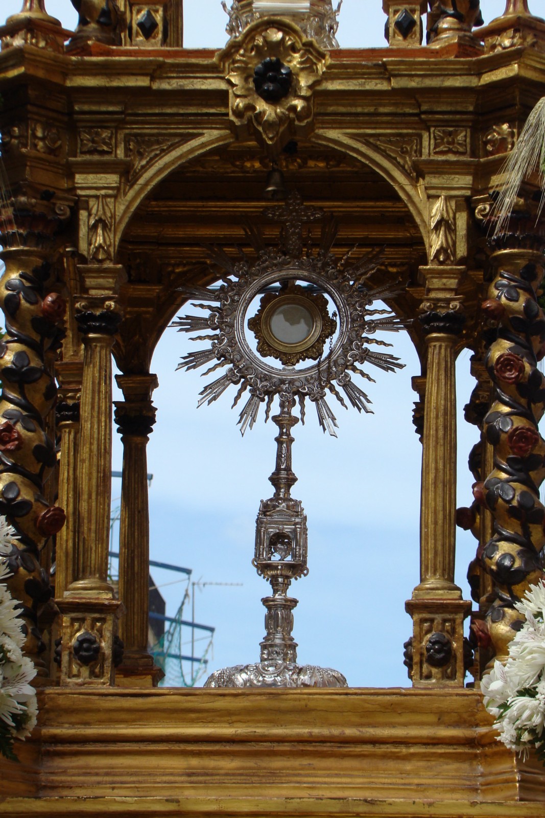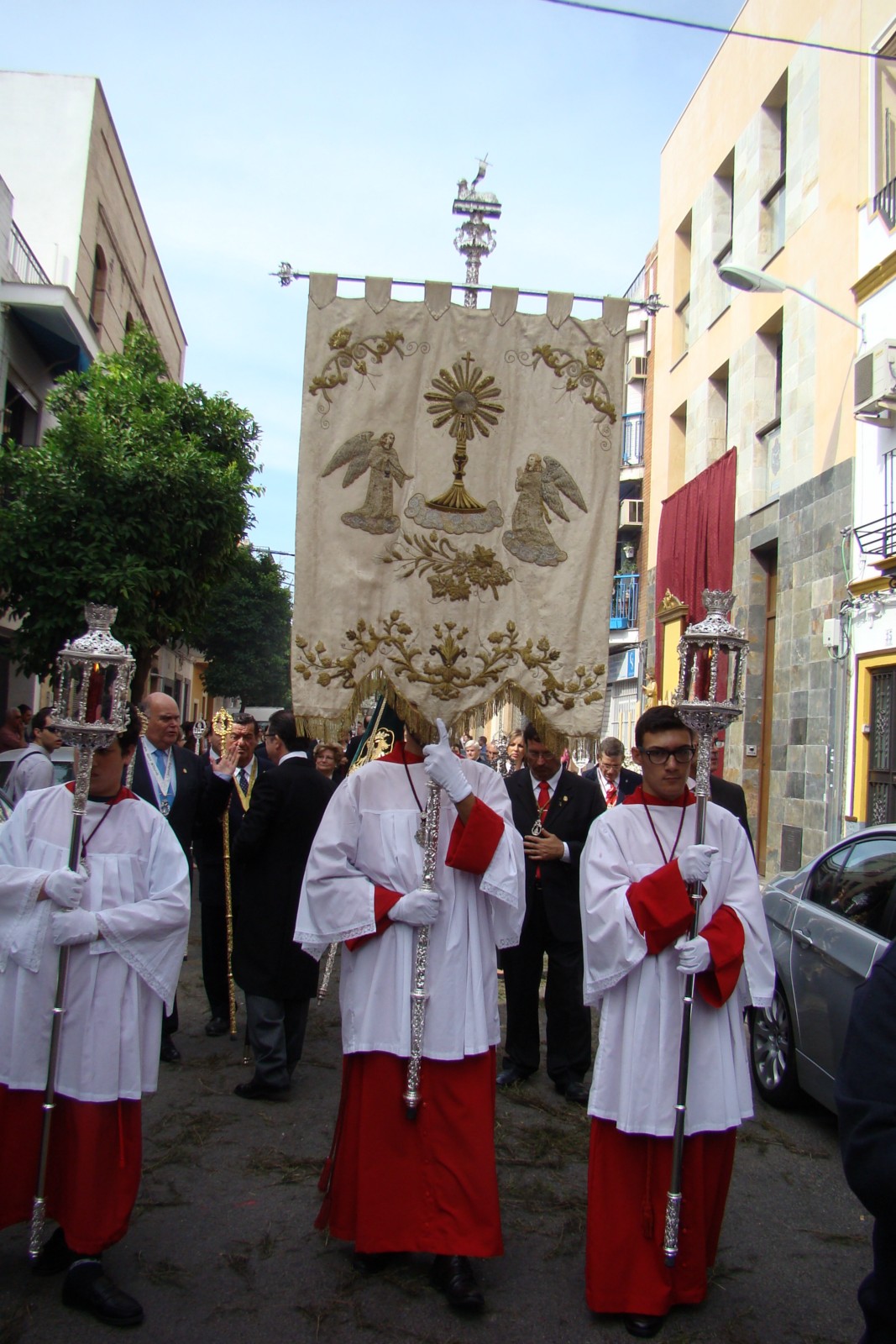» Desde el año 1995, en la mañana del domingo anterior a la celebración litúrgica del Corpus Christi, la parroquia de Nª Sª de los Dolores enclavada en el popular barrio del Cerro del Águila junto con la Hermandad Sacramental radicada en dicho templo realiza su procesión de Corpus por las calles aledañas a la iglesia. En el único paso, Jesús Sacramentado va entronizado en una custodia que es una obra anónima fechada en el siglo XVII .»