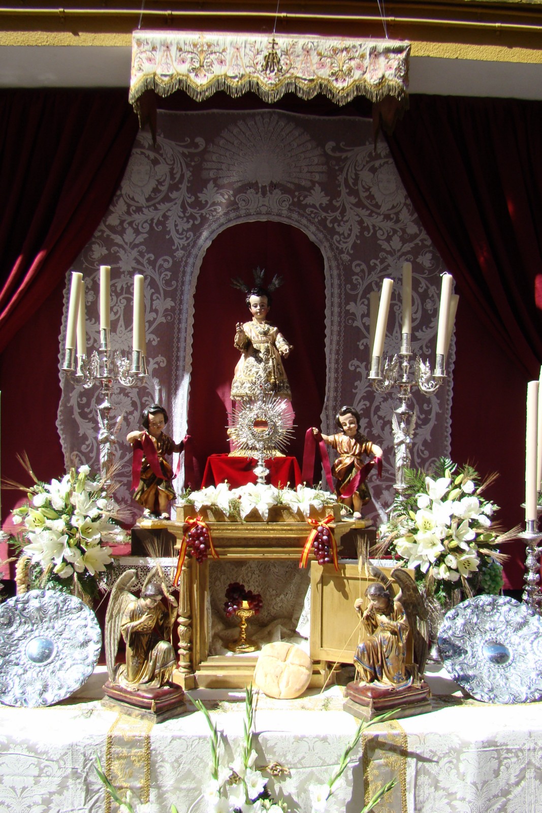 » A lo largo del recorrido del Corpus trianero es tradición de que numerosos vecinos instalen altares en los zaguanes y puertas de sus domicilios, así como engalanar las fachadas y balcones de los mismos. También es costumbre que las diversas Hermandades de penitencia y de gloria del barrio monten altares en sus calles.»
