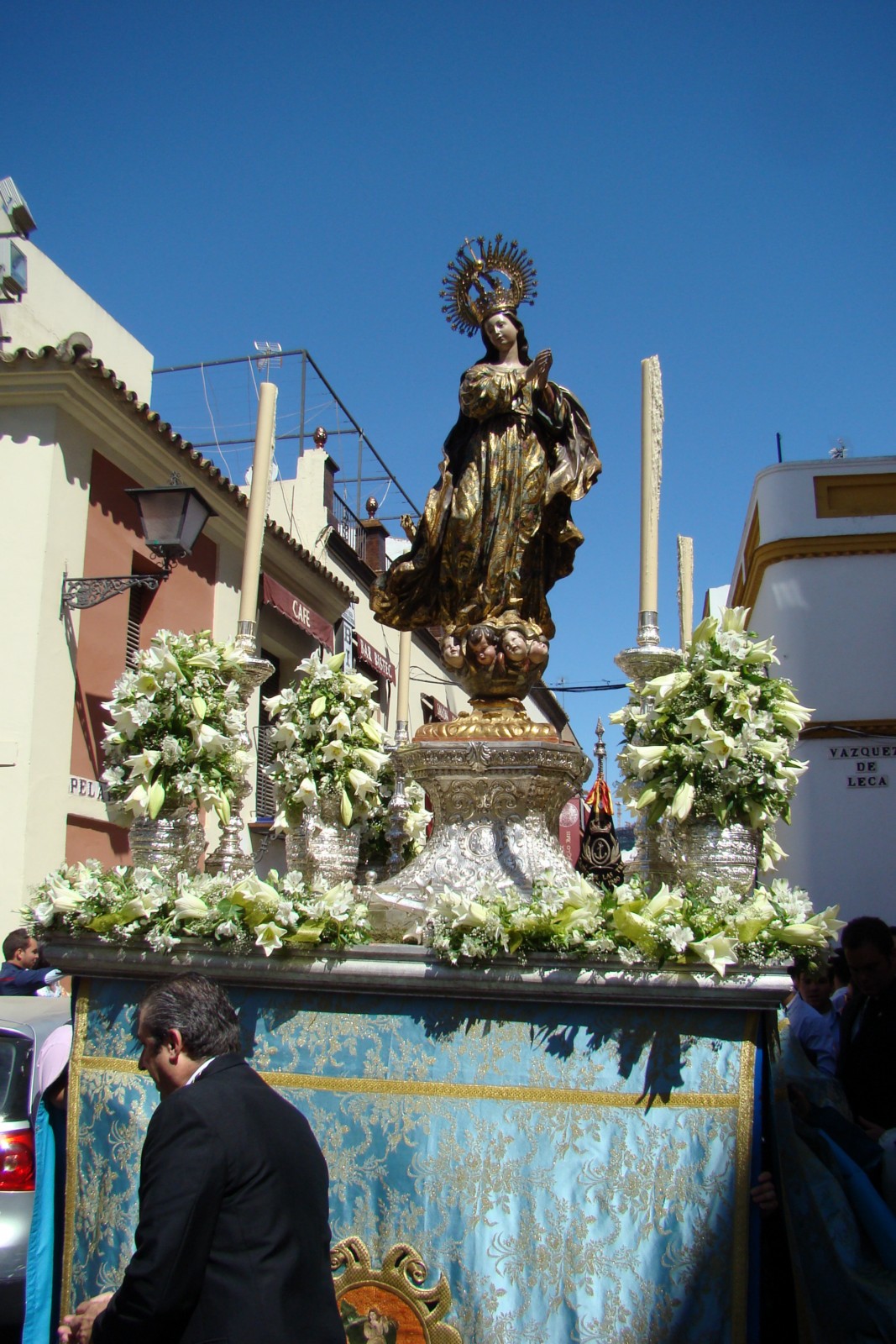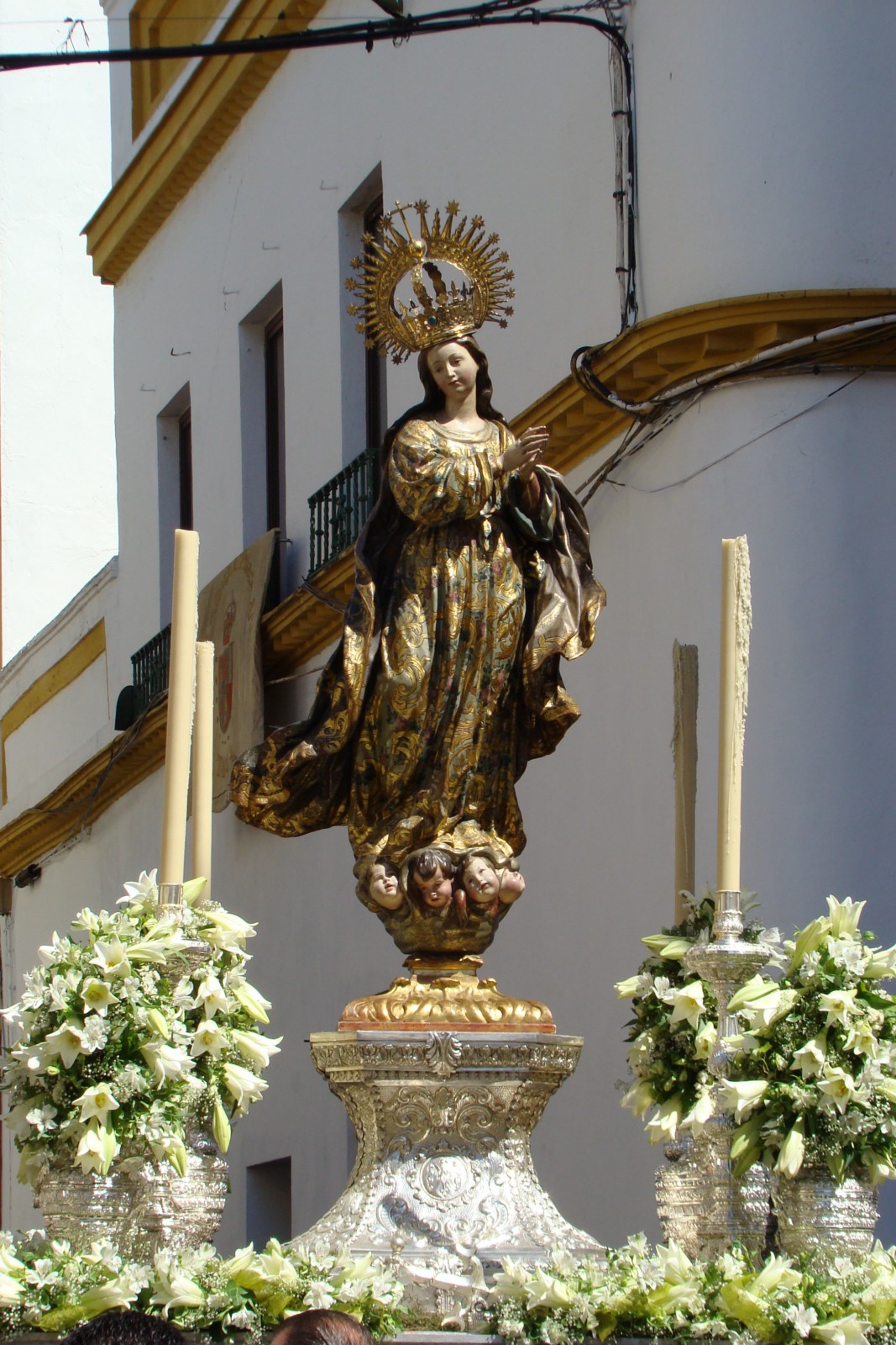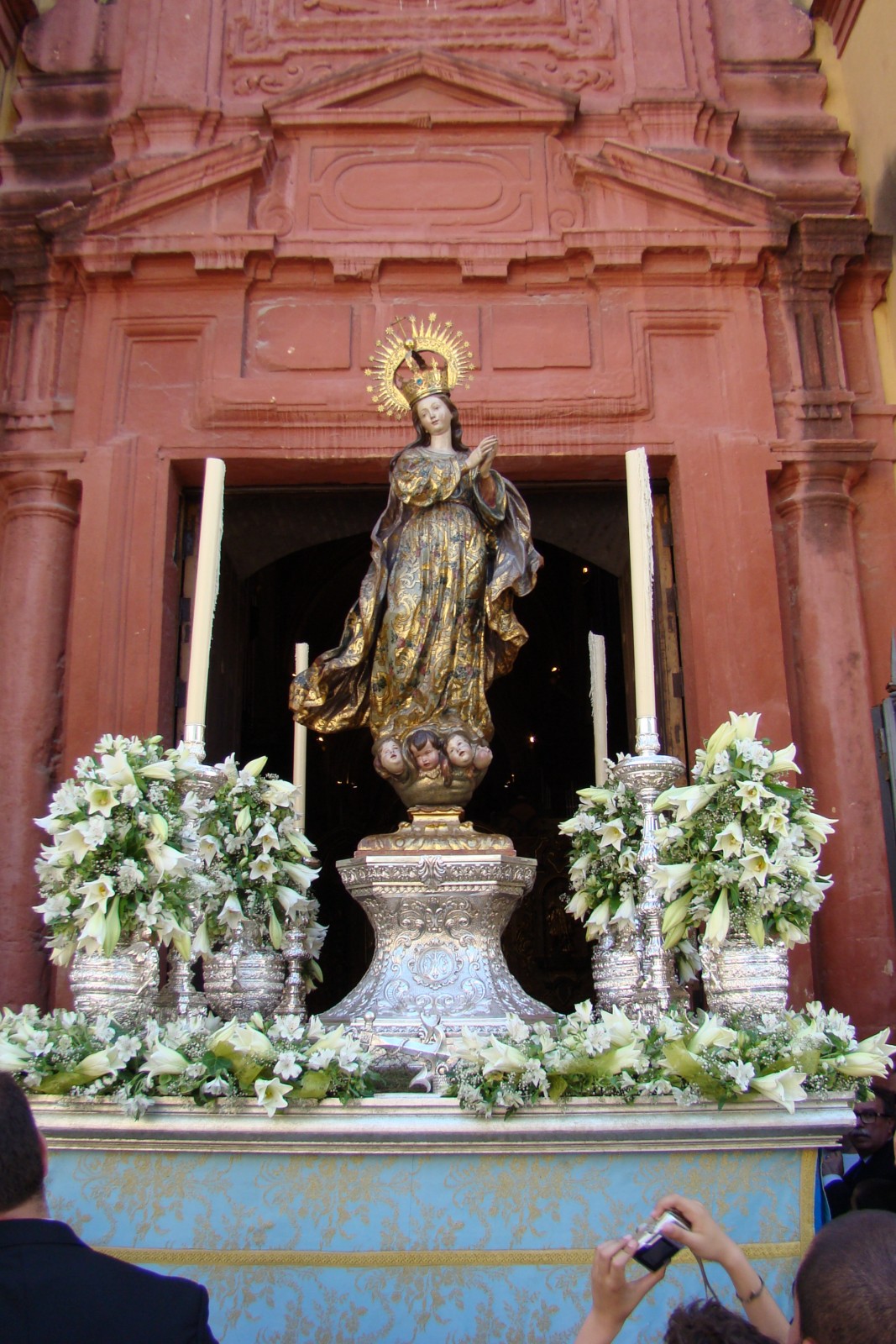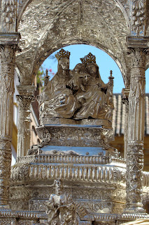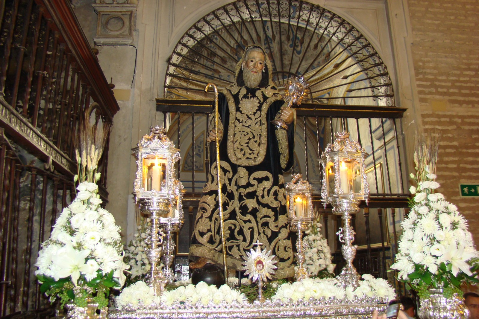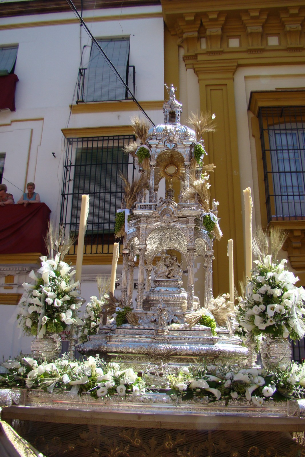 La magnífica custodia procesional fue realizada en 1726 por Andrés Ossorio añadiéndose posteriormente la peana ejecutada por los plateros Garay y Amat.»