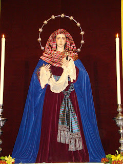 Llega la cuaresma y siguiendo una antigua tradición las dolorosas sevillanas son vestidas de “hebrea” que es como se conoce a este sencillo atuendo realizado con telas de raso de color azul y terciopelos rojos. Casi todas las vírgenes son vestidas así en esta época excepto algunas excepciones que lo hacen en otras fechas o sencillamente no las visten nunca con este atuendo.