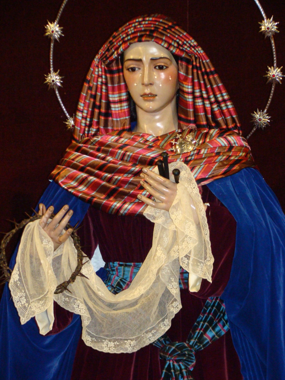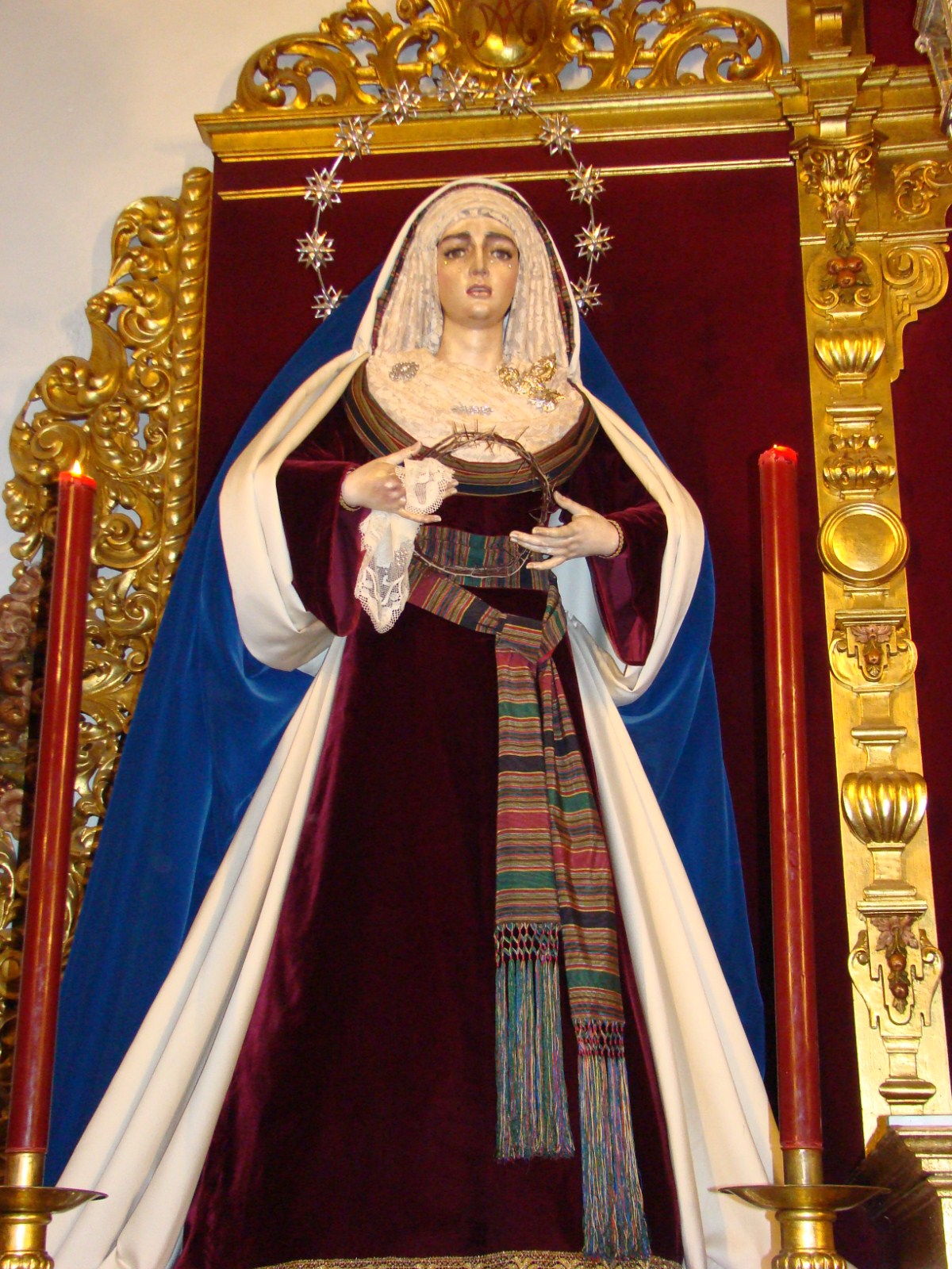 Llega la cuaresma y siguiendo una antigua tradición las dolorosas sevillanas son vestidas de “hebrea” que es como se conoce a este sencillo atuendo realizado con telas de raso de color azul y terciopelos rojos. Casi todas las vírgenes son vestidas así en esta época excepto algunas excepciones que lo hacen en otras fechas o sencillamente no las visten nunca con este atuendo.