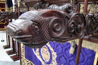» Contemplando la vista general del paso del Santísimo Cristo de la Piedad puede pasar inadvertido el hecho de que sus maniguetas no son idénticas, como podrán apreciar estas tienes formas zoomórficas representando diferentes animales, lo cual es una rareza por lo infrecuente, ya que lo habitual es que todas las maniguetas de un paso sean iguales.»