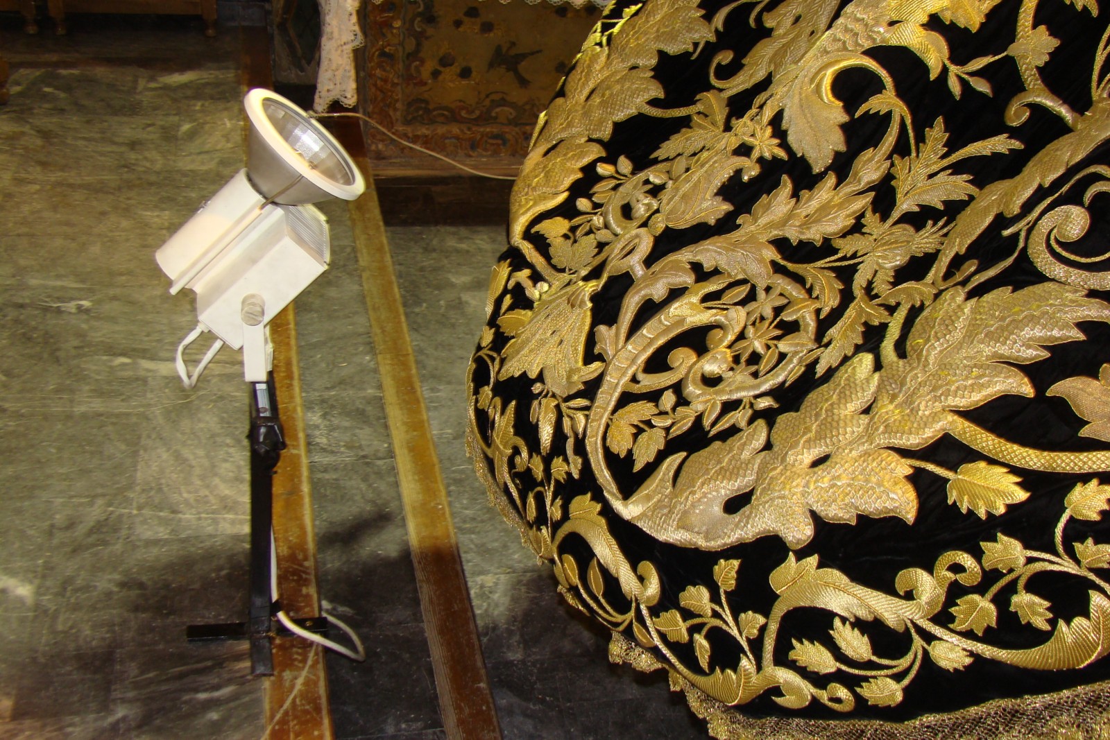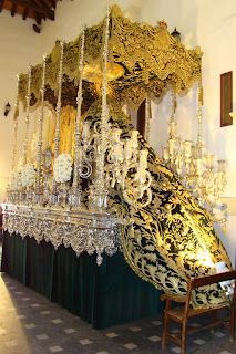 «En Alcalá del Río,las dos hermandades que residen en la Capilla de San Gregorio de Osset tienen la costumbre de iluminar eléctricamente los mantos de sus dolorosas en los días previos a sus salidas procesionales para una mejor contemplación. Como la capilla es de reducidas dimensiones y además se encuentran en ella cinco pasos pues hay que agudizar el ingenio como salta a la vista de nuestras fotografías.»