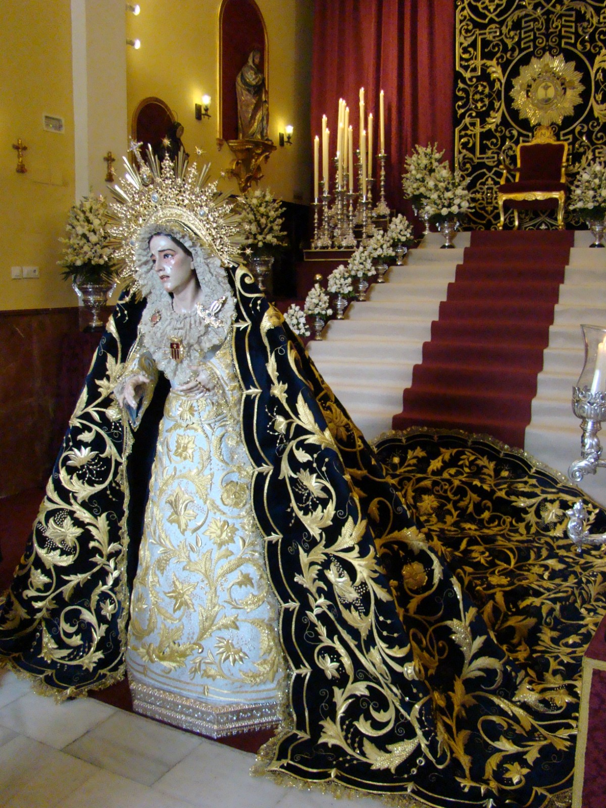 » El domingo 23 de septiembre la imagen de Nª Sª de los Dolores y Misericordia de la Hermandad de Jesús Despojado ha estado expuesta en solemne besamanos. Este año este culto ha tenido una especial solemnidad debido que se cumple el cincuentenario de la realización de la imagen por parte del escultor D.Antonio Eslava en 1962, por ello la priostía ha montado un altar de besamanos especial, acorde con la efemérides que se celebraba. La Virgen lucía el manto de salida realizado por Grande de León el año pasado.»