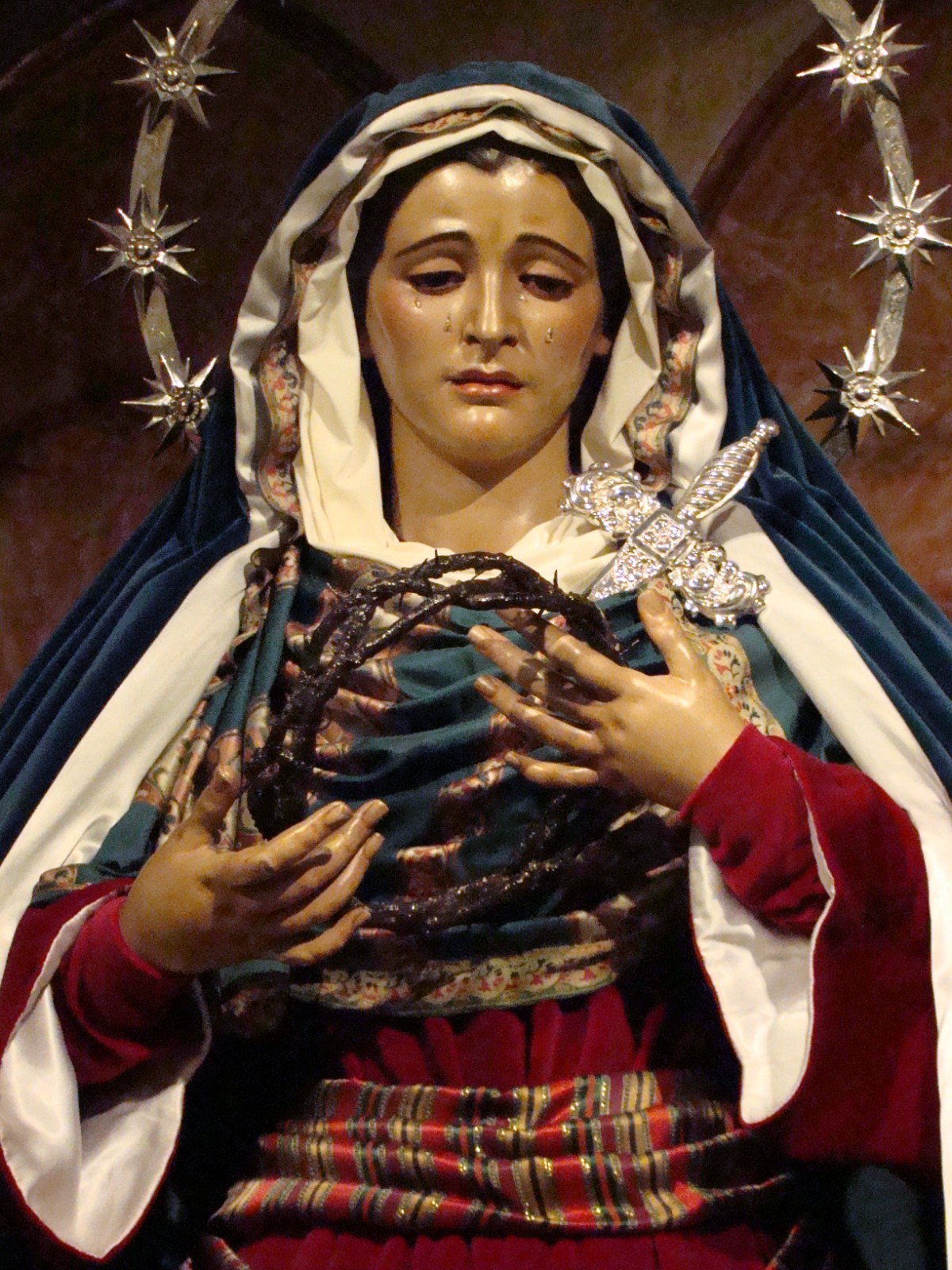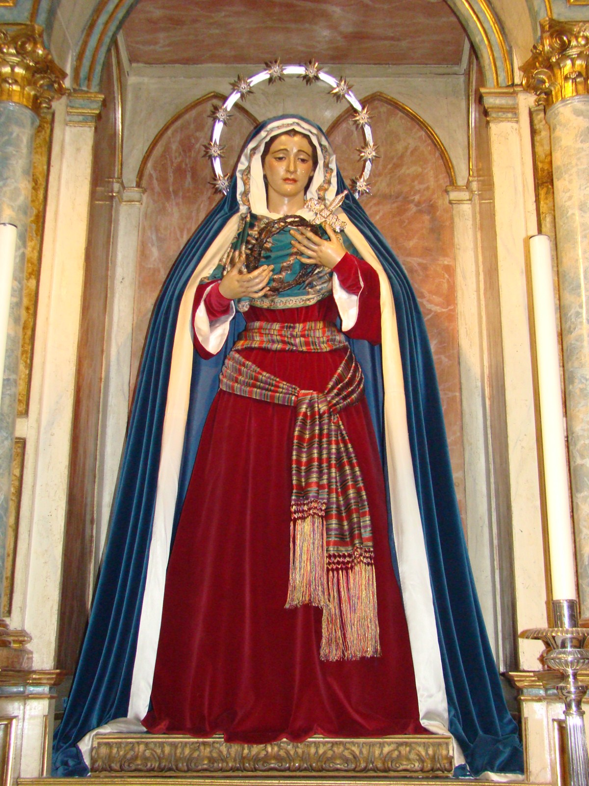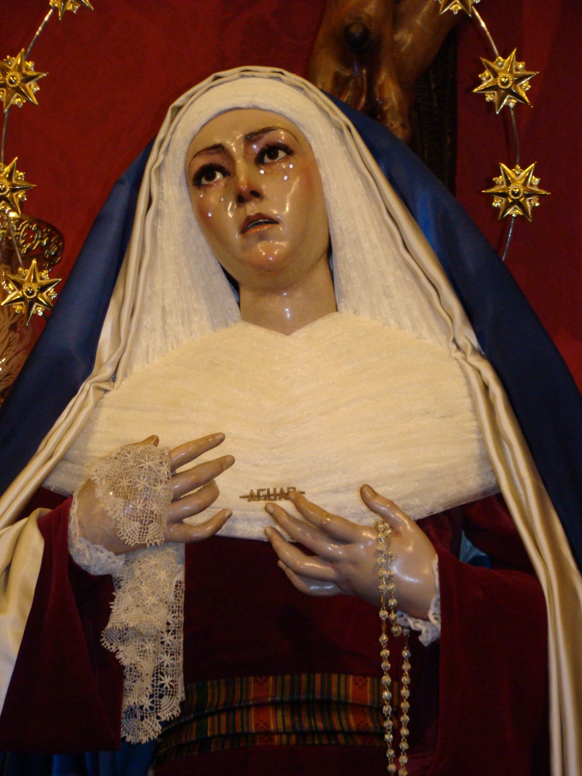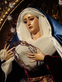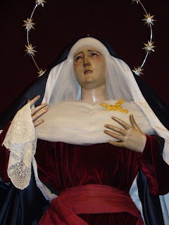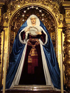 Llega la cuaresma y siguiendo una antigua tradición las dolorosas sevillanas son vestidas de “hebrea” que es como se conoce a este sencillo atuendo realizado con telas de raso de color azul y terciopelos rojos. Casi todas las vírgenes son vestidas así en esta época excepto algunas excepciones que lo hacen en otras fechas o sencillamente no las visten nunca con este atuendo.