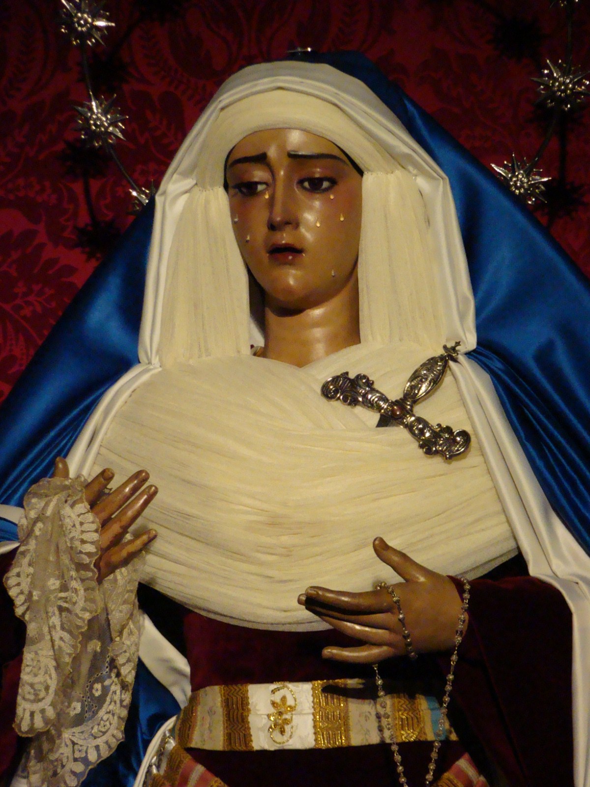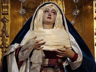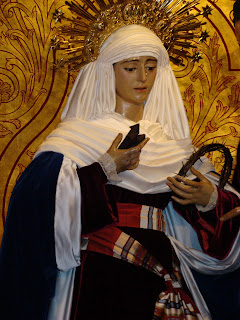 Llega la cuaresma y siguiendo una antigua tradición las dolorosas sevillanas son vestidas de “hebrea” que es como se conoce a este sencillo atuendo realizado con telas de raso de color azul y terciopelos rojos. Casi todas las vírgenes son vestidas así en esta época excepto algunas excepciones que lo hacen en otras fechas o sencillamente no las visten nunca con este atuendo.