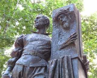 Continuando con los monumentos donde aparece la imagen del Gran Poder es evidente que hablemos del erigido al autor del mismo Juan de Mesa. Este monumento situado en la misma plaza de San Lorenzo intenta ser un homenaje al escultor imaginero cordobés que durante tantos años fue un desconocido a pesar de que su obra escultórica para la semana santa sevillana se encuentre entre lo más destacado de la misma por su calidad artística y devocional, un acto de justicia que la ciudad de Sevilla le debía y que en el año 2005 fue subsanado. El autor del monumento es Sebastián Santos Calero y fue inaugurado en febrero del año 2005. La fundación Cajasur es la que donó el coste de la obra. En el monumento aparece en primer plano junto a la figura de Juan de Mesa el rostro de su imagen más emblemática. En la parte posterior de la misma aparecen grabados los nombres de las advocaciones de otras imágenes destacadas del mismo autor que mayoritariamente procesionan en la semana santa. Curiosamente en esta relación existe una notable ausencia, suponemos que por olvido, ya que no aparece el Cristo de la Veracruz de Las Cabezas de San Juan, obra perfectamente documentada desde 1983 cuando se restauró el crucificado, ya que en su interior apareció un documento con la firma de Juan de Mesa y la fecha de ejecución 1624.