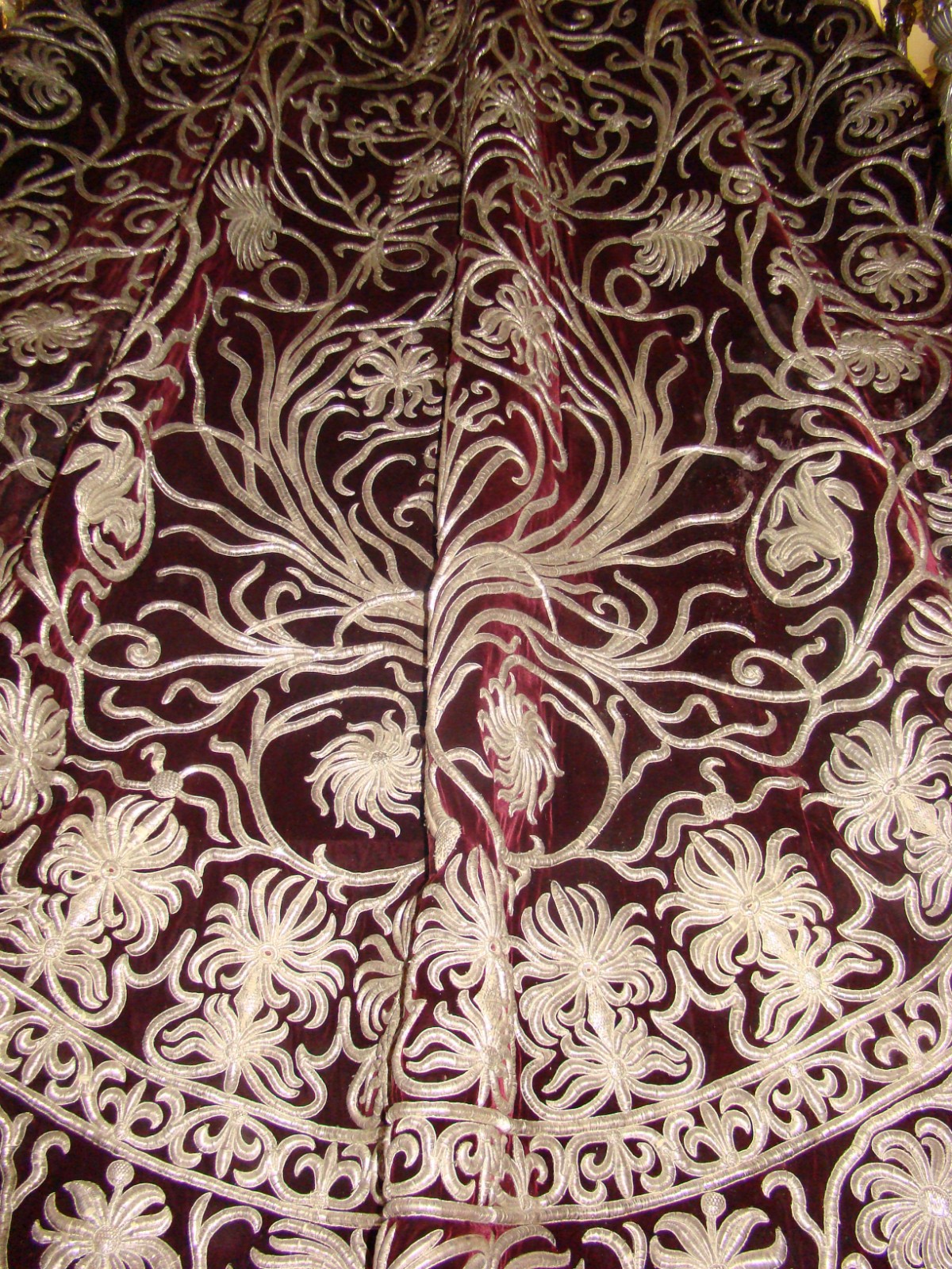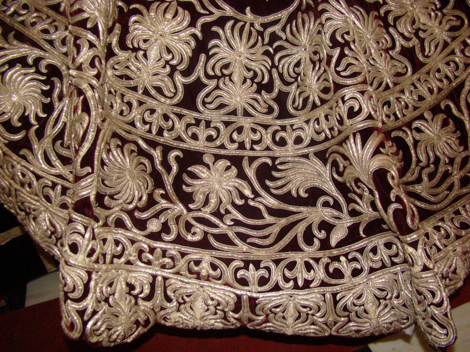 » La edición del presente año de Círculo de Pasión se encuentra dedicada a la Hermandad del Valle, desde el pasado viernes podemos contemplar diversos enseres de su destacado patrimonio, sin embargo se ha perdido la oportunidad de acercar hasta Sevilla para conocimiento de las nuevas generaciones, una pieza que forma parte de su pasado. Se trata del manto de salida que en 1905 realizara la bordadora Patrocinio Vázquez con diseño del escultor José Ordoñez , con el que la Virgen del Valle procesionó hasta el año 1918 ya que al siguiente año lo hizo sobre las sienes de Nª Sª de los Dolores , titular mariana de la Hermandad de la Veracruz de Huelva. Este manto fue sustituido por el que tiene en la actualidad, bordado por Juan Manuel Rodríguez Ojeda en 1920. En este mismo año fue adquirido por la Condesa de Mora Claros por la cantidad de 35.000 pesetas quién lo donó a la Hermandad onubense en 1956. Una pieza centenaria que forma parte de la Semana Santa del Ayer de Sevilla y que se puede admirar por las calles de Huelva el jueves santo. Fué restaurado en 1982 en el taller de Sobrinos de José Caro y se le conoce popularmente por «el manto de los fideos».