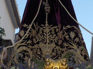 Tuvimos ocasión de verlo procesionar con una túnica de terciopelo morado bordada en oro en el siglo XVIII distinta a la lisa con la que procesiona el Viernes Santo.
