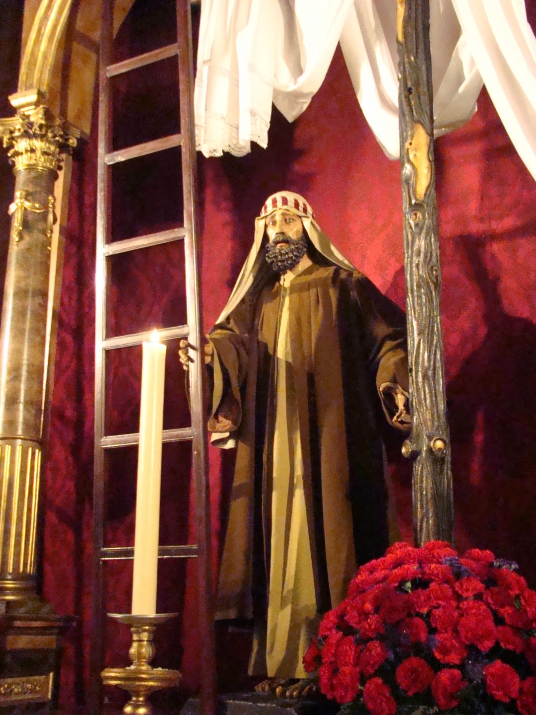En estos días en que la Hermandad del Buen Fin está celebrando el quinario a su sagrado titular el Santísimo Cristo del Buen Fin, además de montar un magnífico altar de cultos ha tenido el detalle de colocar otro mucho más discreto pero lleno de significado y originalidad en el retablo que habitualmente ocupa el crucificado. En vez de dejarlo vacio ha utilizado las imágenes que realizara Luis Álvarez Duarte de Nicodemo y José de Arimatea, pertenecientes al antiguo misterio del paso de Cristo para hacer una original composición.