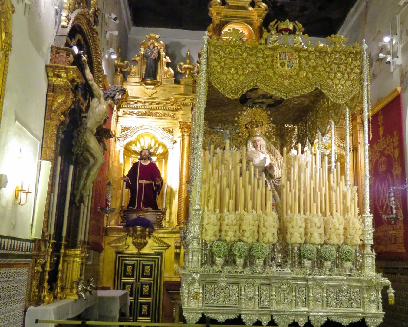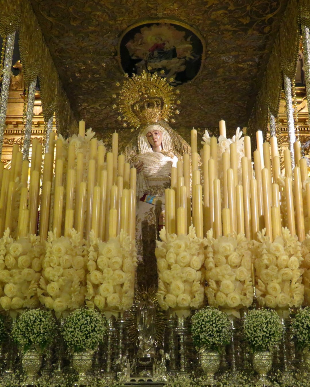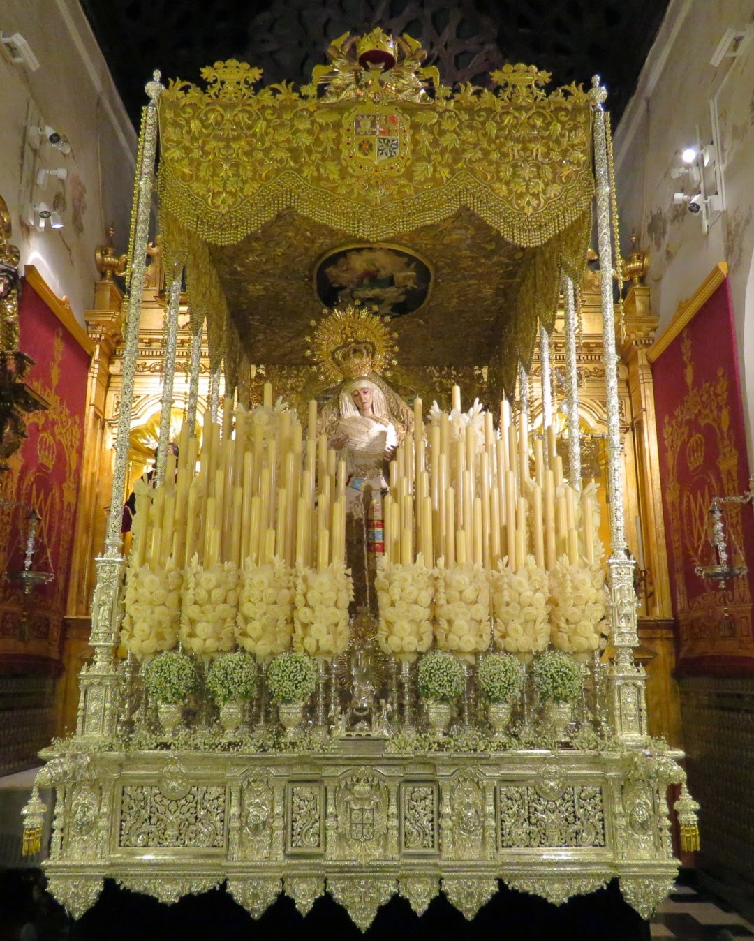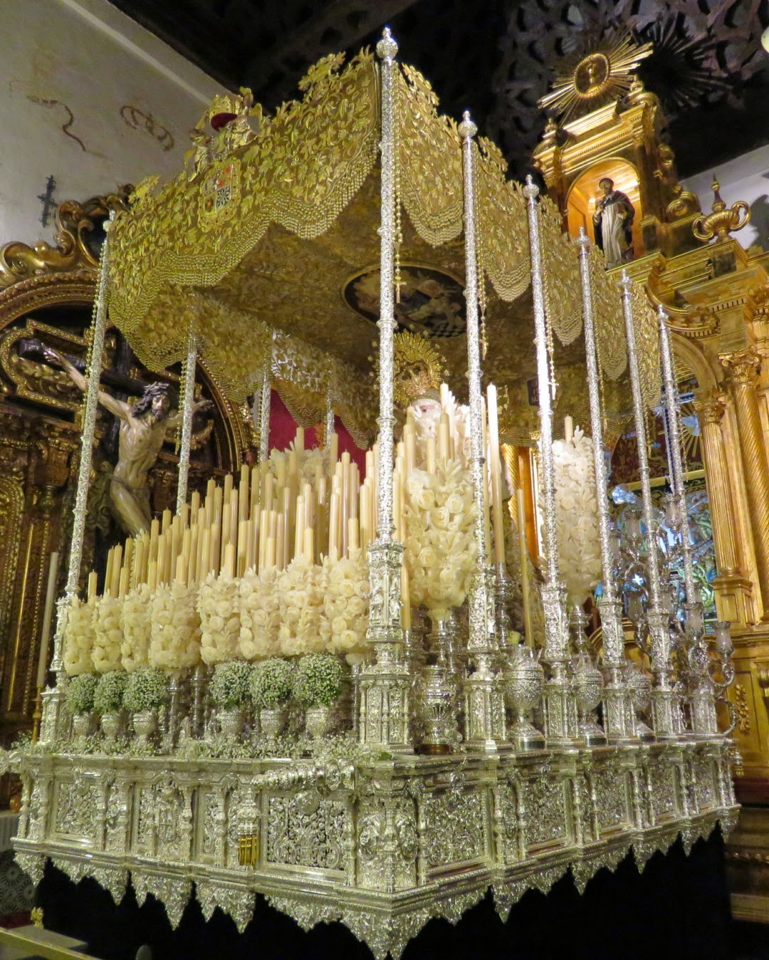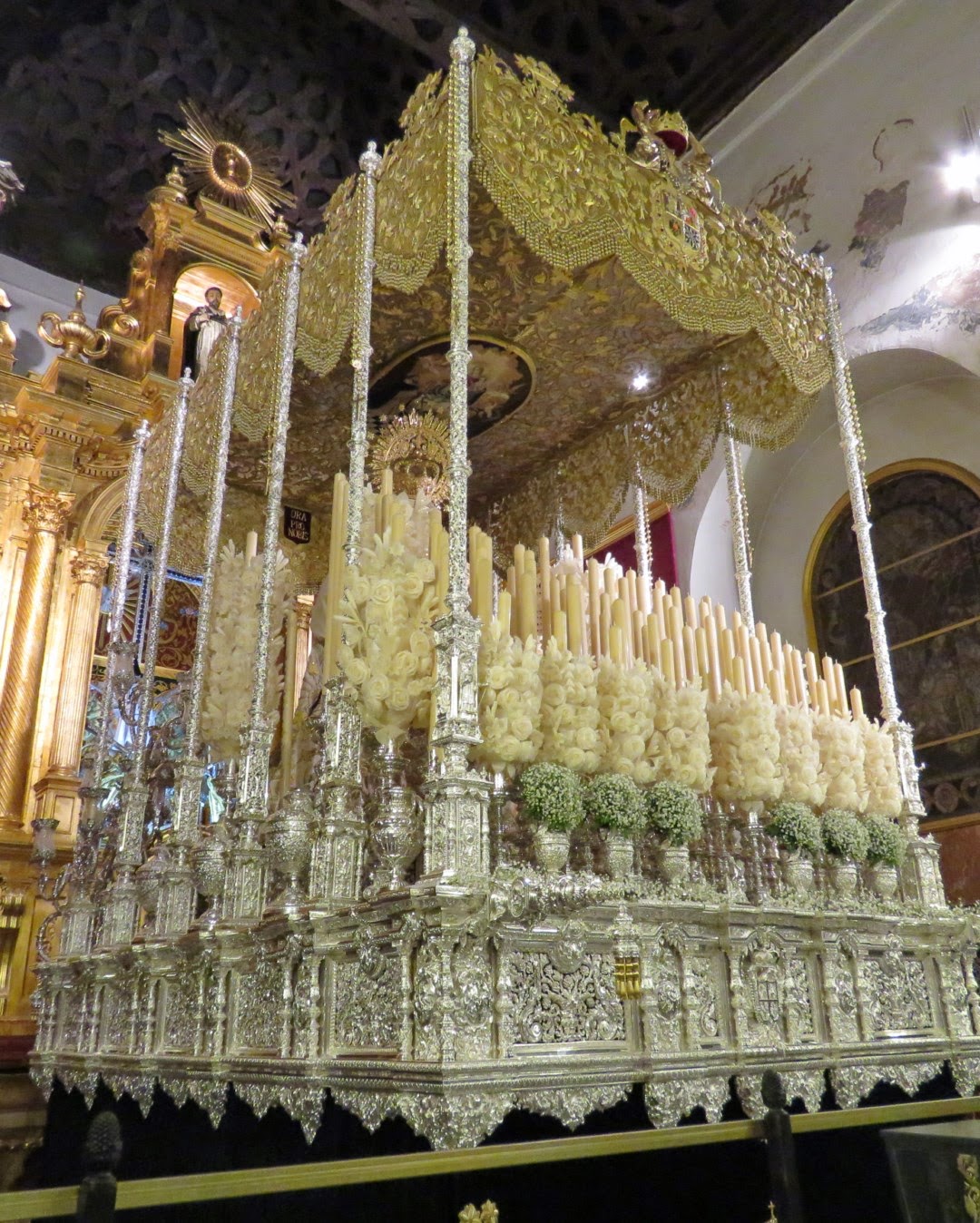 Cuando aún faltan diez días para el Domingo de Ramos ya podemos contemplar en Sevilla un paso de palio completamente terminado de montar. Se trata del de María Santísima del Rosario en sus misterios dolorosos de la Hermandad de Montesión, solo le falta el exorno floral.