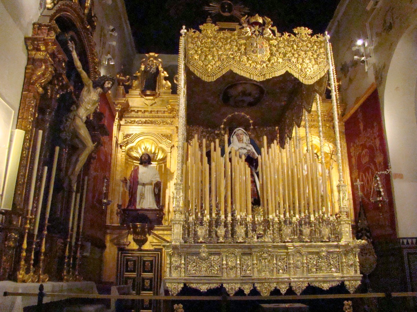 Hoy lunes 24 de marzo al pasar por la Capilla de la Hermandad de Montesión hemos tenido la agradable sorpresa de poder contemplar ya prácticamente montado el paso de palio de Mª Santísima del Rosario en sus Misterios Dolorosos Coronada, cuando aún quedan 20 días para el Domingo de Ramos y 24 para el Jueves Santo podemos afirmar con casi total seguridad que es el primer paso de la venidera semana santa sevillana que ya se puede admirar en nuestras iglesias.