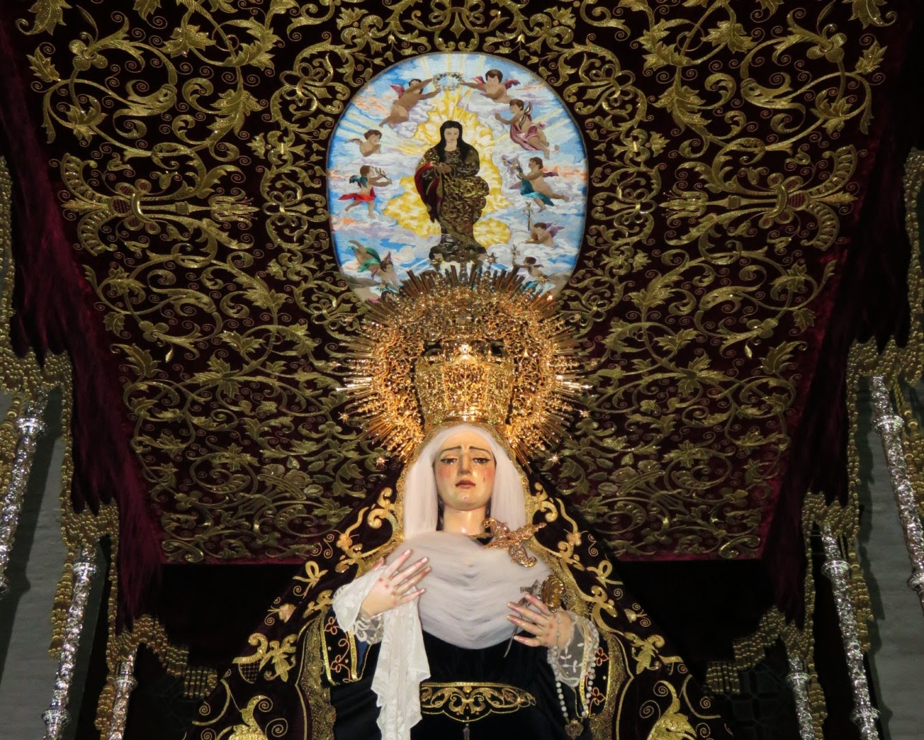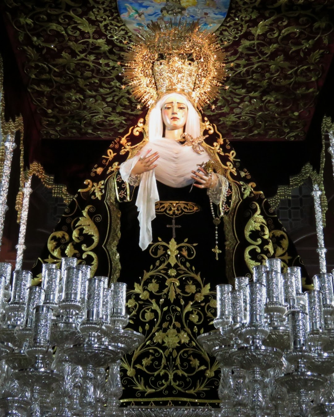 La virgen de Gracia y Amparo de la Hermandad de los Javieres ya luce en su paso para la próxima salida procesional del martes santo. Entre las prendas que viste, luce la nueva saya bordada obra de Francisco Javier Sosa Sánchez. Esta pieza ha sido realizada gracias al grupo joven de la Hermandad que la ha donado. La saya se hace a partir de los bordados de una casulla adquirida en un anticuario.