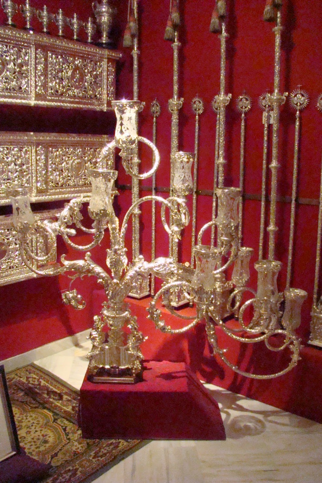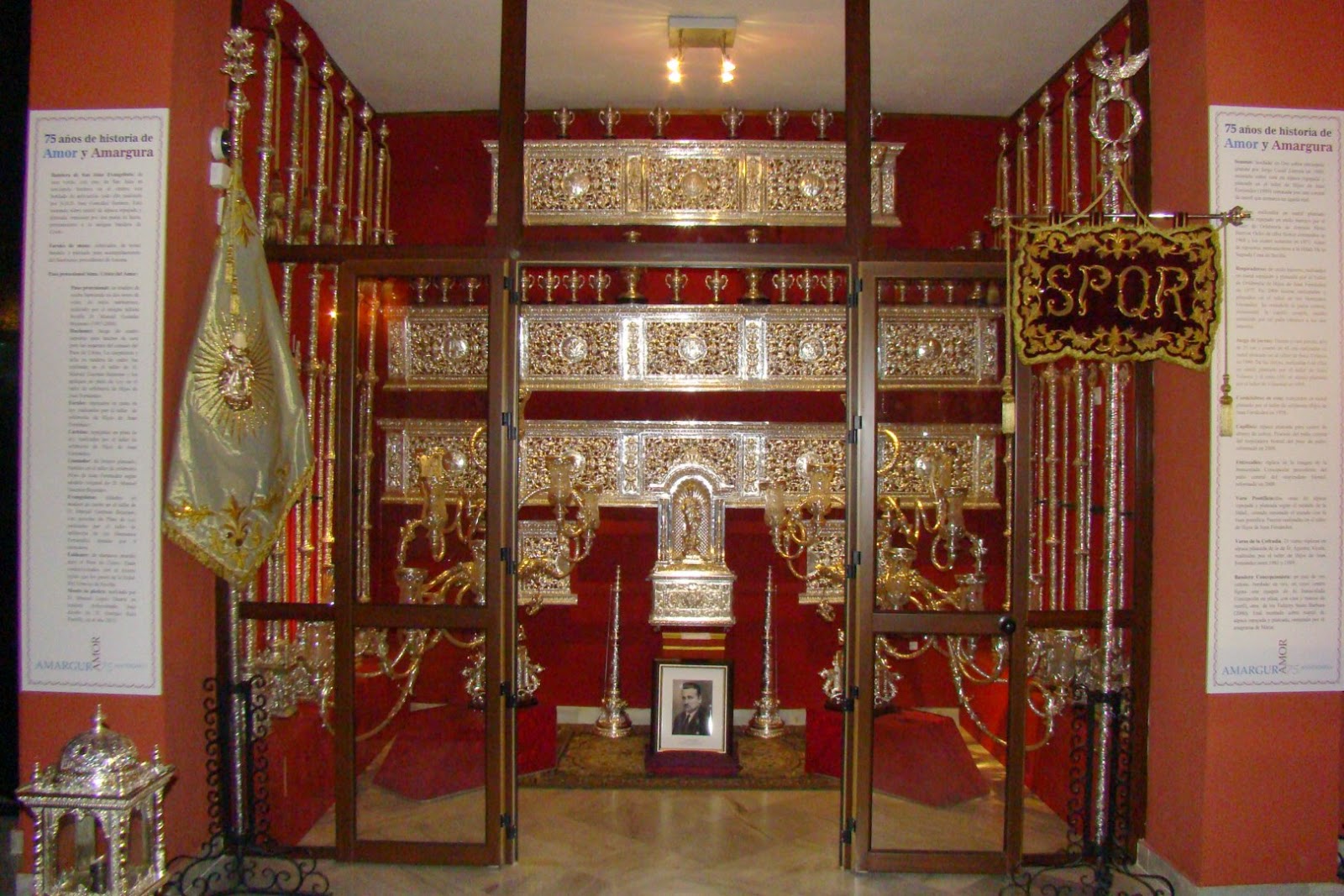 Con el título de “ 75 años de historia de Amor y Amargura” la Antigua, Pontificia, Ilustre y Fervorosa Hermandad Sacramental de Dios, Ánimas, Concepción y Cofradía de Nazarenos del Santísimo Cristo del Amor y Nª. Sª. de la Amargura de la localidad sevillana de Alcalá de Guadaira ha organizado en su Casa-Hermandad una exposición conmemorativa de su setenta y cinco aniversario fundacional. Allá por el año 1940 se fundó esta hermandad alcalareña en el céntrico templo de San Sebastián donde continua . En la muestra se exponen los enseres de la hermandad desde los más antiguos hasta los actuales, así como documentos de relevancia para la historia de la propia hermandad. En esta segunda entrega los enseres pertenecientes al actual paso de palio, realizados por los orfebres Juan Domínguez e hijos, Seco Velasco y Villarreal. Destacar que los varales pertenecieron en su día al paso de Nª Sª del Subterráneo de la Hermandad de la Cena de Sevilla.