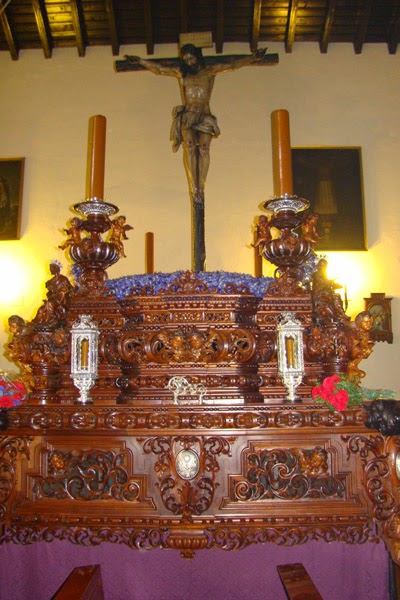 Con el título de “ 75 años de historia de Amor y Amargura” la Antigua, Pontificia, Ilustre y Fervorosa Hermandad Sacramental de Dios, Ánimas, Concepción y Cofradía de Nazarenos del Santísimo Cristo del Amor y Nª. Sª. de la Amargura de la localidad sevillana de Alcalá de Guadaira ha organizado en su Casa-Hermandad una exposición conmemorativa de su setenta y cinco aniversario fundacional. Allá por el año 1940 se fundó esta hermandad alcalareña en el céntrico templo de San Sebastián donde continua . En la muestra se exponen los enseres de la hermandad desde los más antiguos hasta los actuales, así como documentos de relevancia para la historia de la propia hermandad. En esta tercera entrega les mostramos el actual paso de Cristo obra realizada por el tallista Manuel Guzmán Bejarano a principios de la década del 2000.