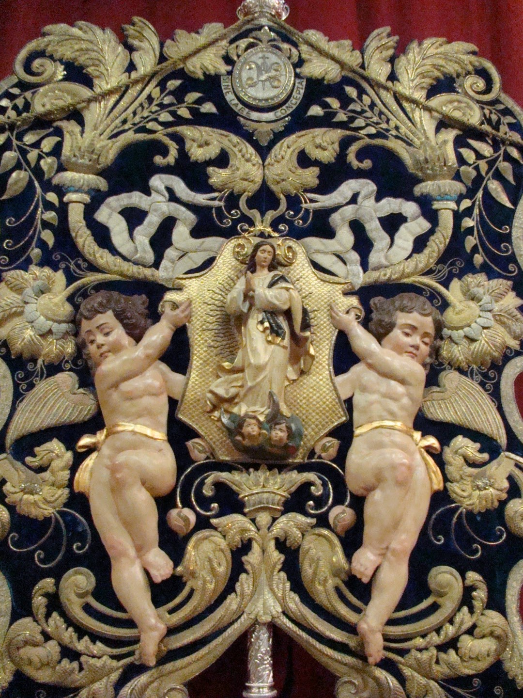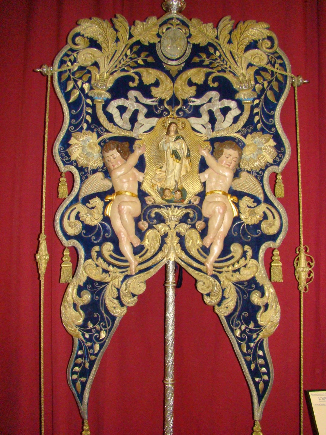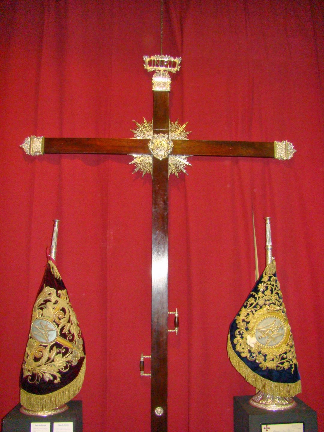 En esta segunda entrega les mostramos los estandartes e insignias que posee la Hermandad para su salida procesional, destaca entre todos ellos el Simpecado realizado en 1952 con bordados de Esperanza Elena Caro y tallas de Enrique Orce.