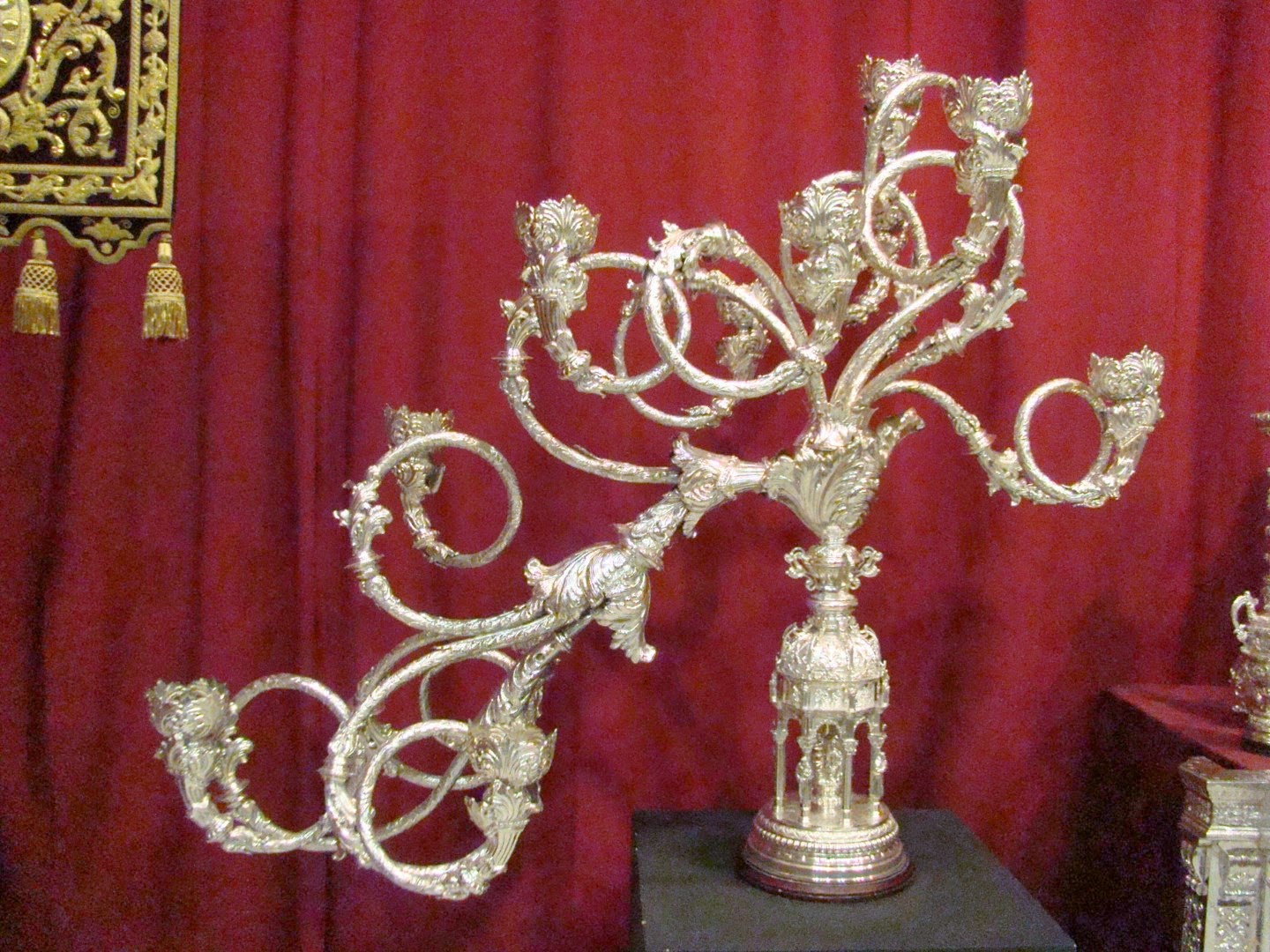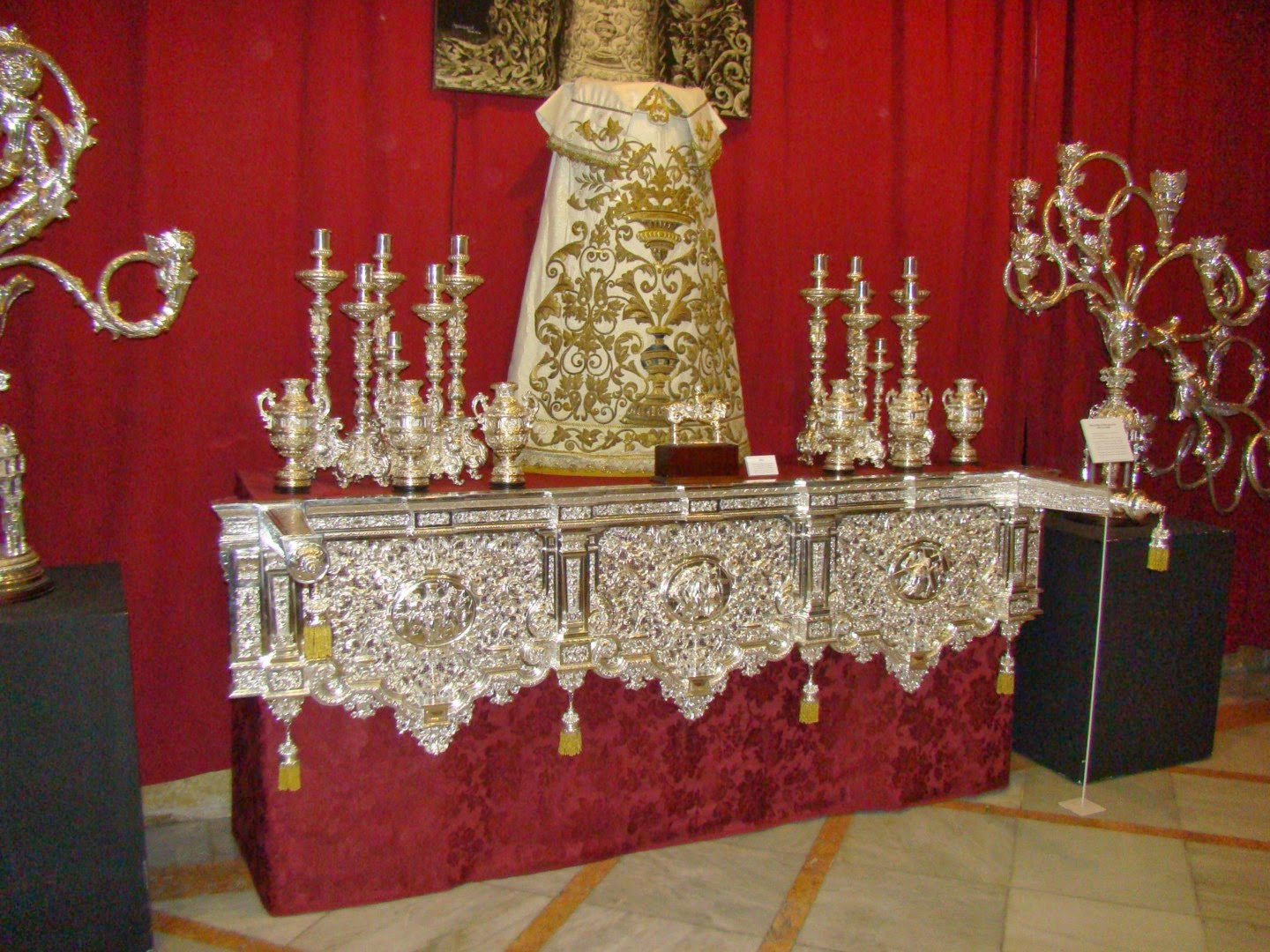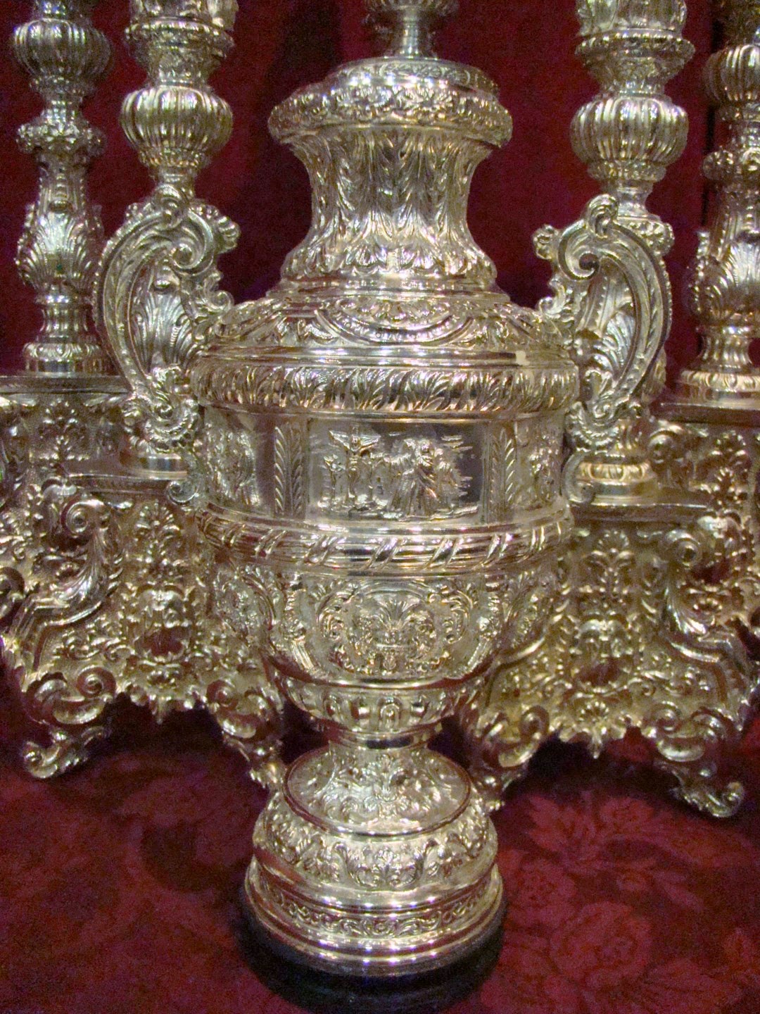En esta tercera entrega les mostramos los respiraderos del paso de palio obra de Seco Velasco junto con otras piezas de orfebrería, jarras, candelería y candelabros de cola realizados por Manuel de los Ríos. El llamador es obra de Ángel Gabella en 1981 y los paños de bocina están bordados por Elena Caro en 1948.