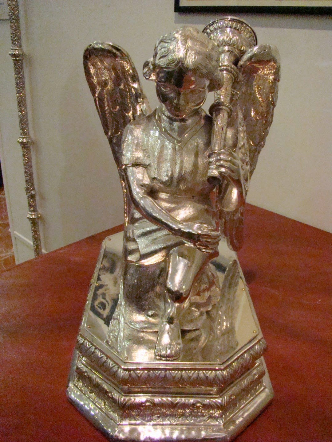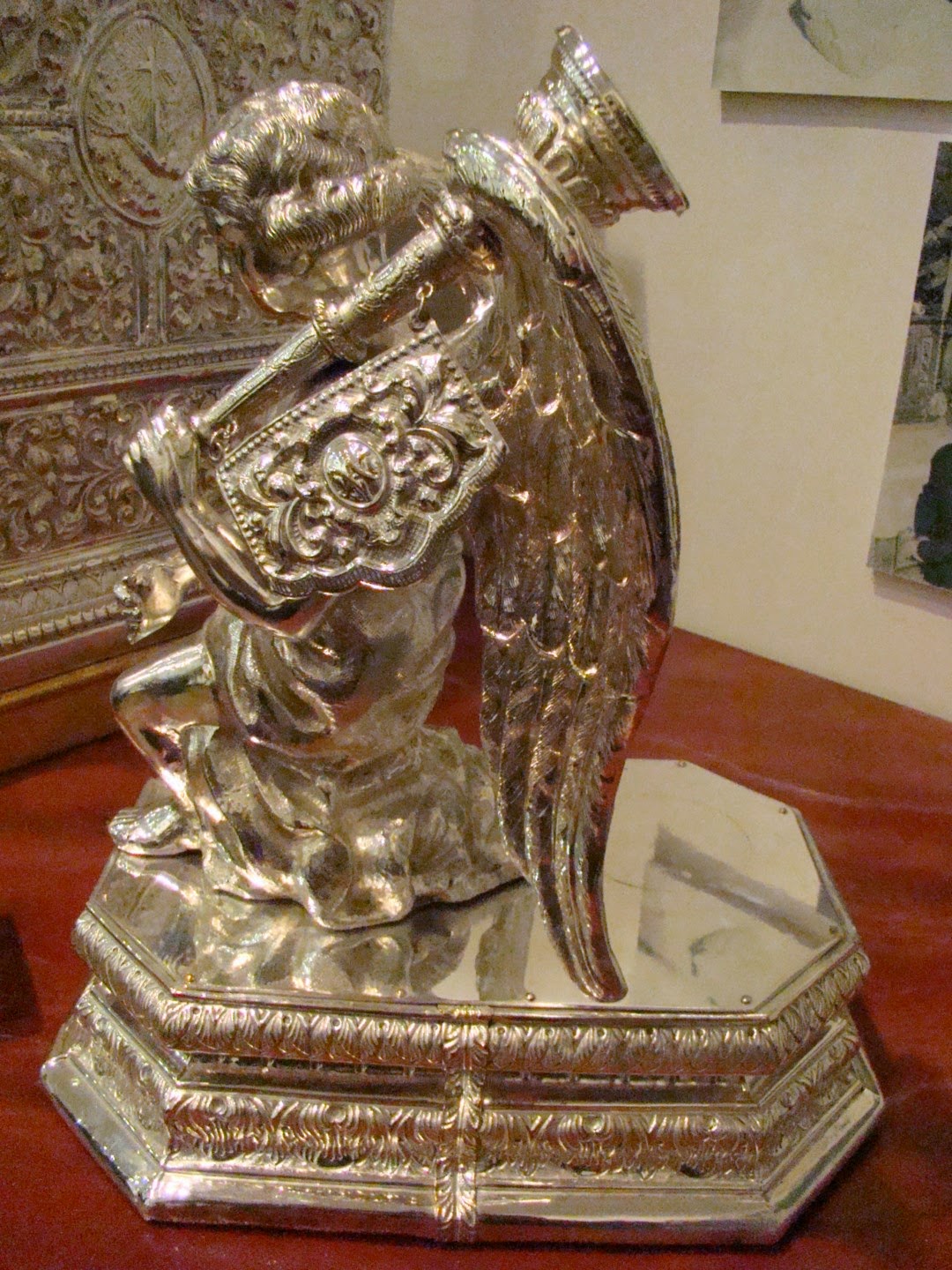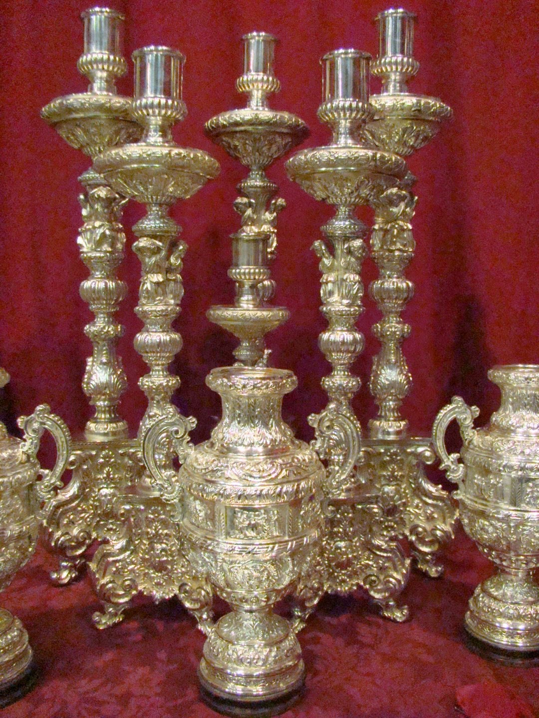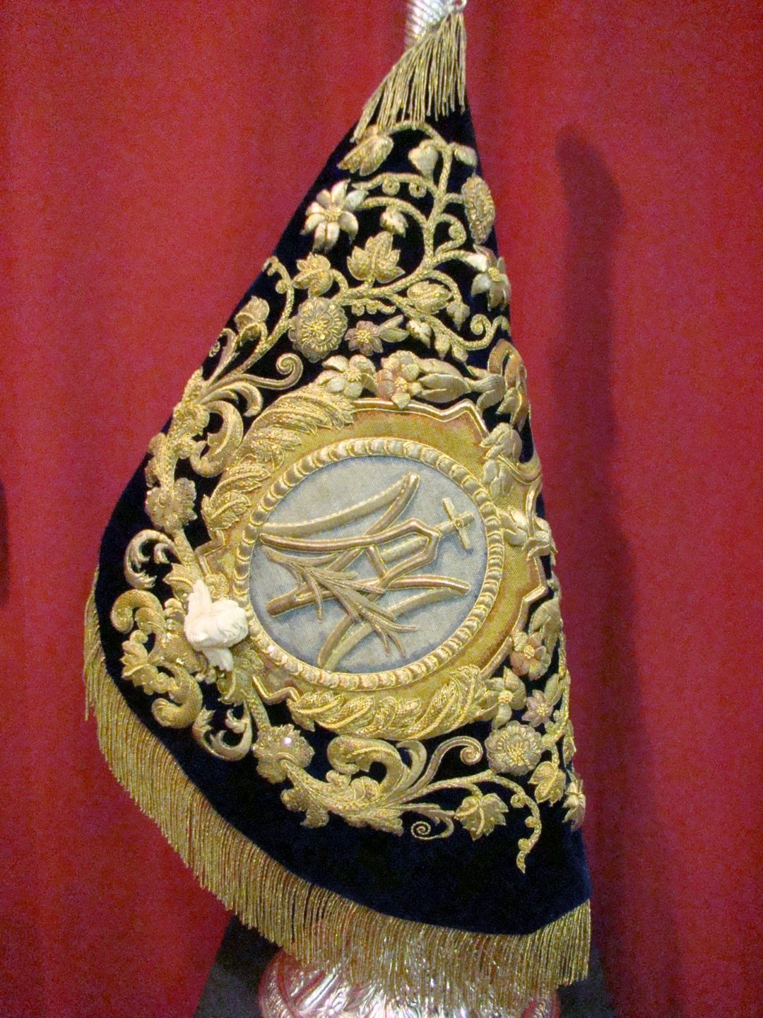 En esta tercera entrega les mostramos los respiraderos del paso de palio obra de Seco Velasco junto con otras piezas de orfebrería, jarras, candelería y candelabros de cola realizados por Manuel de los Ríos. El llamador es obra de Ángel Gabella en 1981 y los paños de bocina están bordados por Elena Caro en 1948.