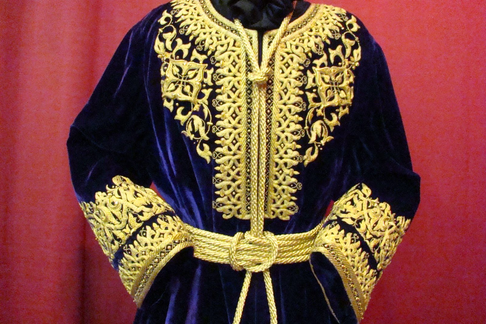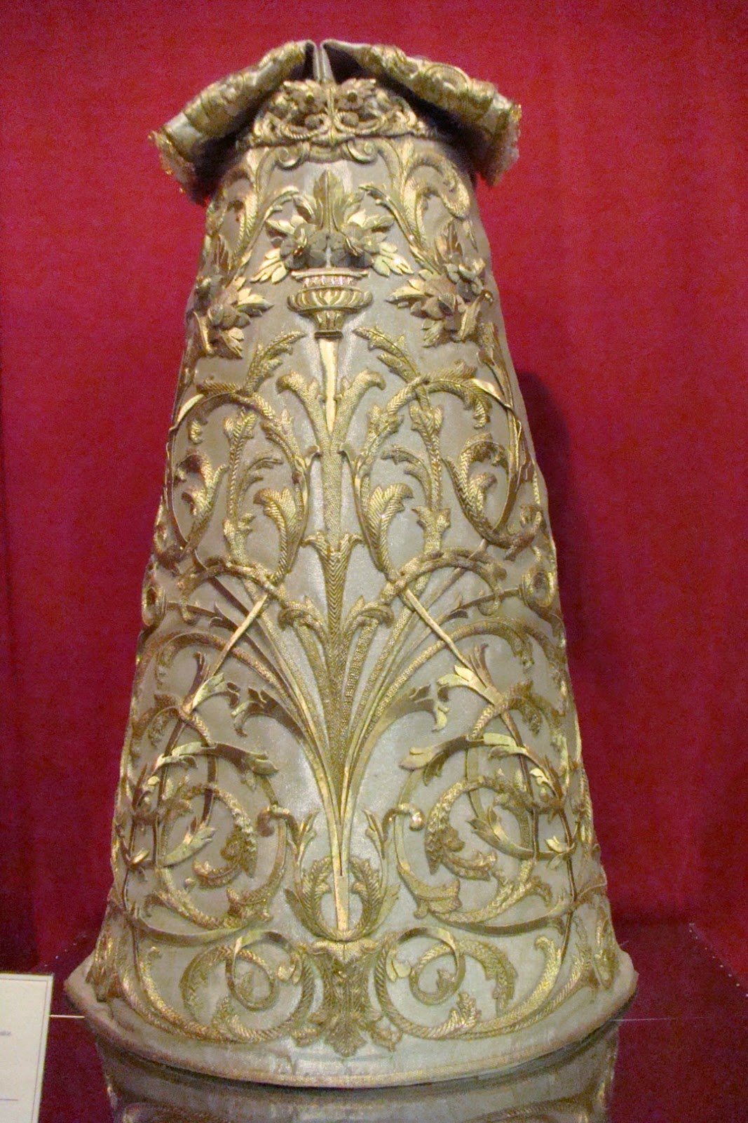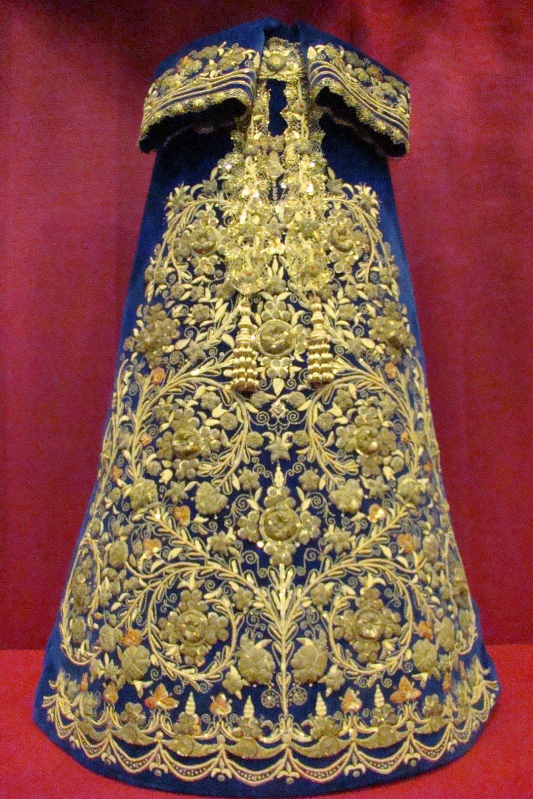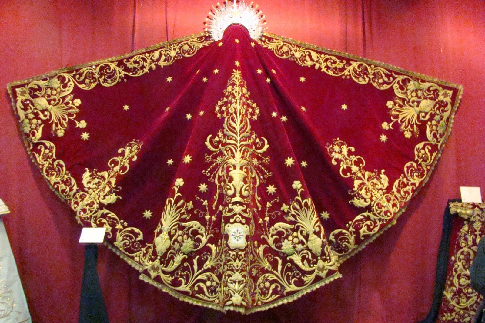 En primer lugar la túnica bordada del Cristo, obra de Mariano Martín Santonja en 2001 con diseño de Javier Sánchez de los Reyes. La bambalina del palio antiguo de 1960 obra del taller de Nª Sª de la Paz “Padilla”. El palio actual obra del taller de Fernández y Enríquez entre 1994 y 1995. El conjunto de sayas de la Virgen, la celeste obra de Luis Miguel Garduño en 2014, la blanca de salida de Fernández y Enríquez en 1997. La azul obra de Antonio Rincón Galicia en 1965 y la roja de 1960 de Padilla enriquecida en 1990 por Garduño. También se muestra el manto de camarín rojo realizado con bordados del antiguo palio.