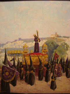 En esta tercera parte les mostramos el apartado pictórico de la exposición, donde se muestran diversos cuadros de diferentes pintores alcalareños que han reflejado en sus lienzos distintos momentos de la procesión, sobre todo la subida al Calvario en la mañana del Viernes Santo. La foto antigua fechada en 1924 corresponde a ese momento en que los tres pasos de la Hermandad suben a la Ermita de San Roque , la imagen del Nazareno que aparece es la antigua imagen desparecida en 1936, atribuida a Felipe de Ribas, siglo XVII.
