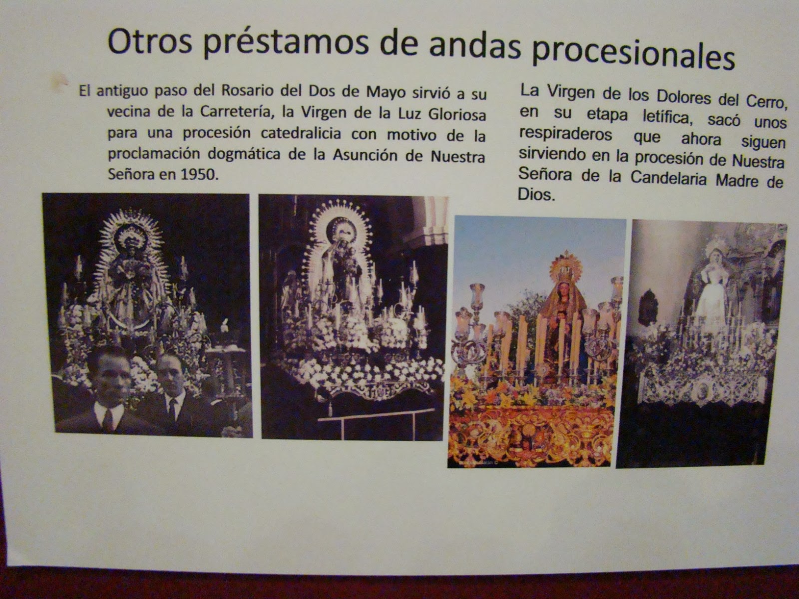 Paso procesional de Nª Sª del Juncal. Peana y sobrepeana de 1968 de Antonio Santos. Respiraderos de 1970 de José López Camacho y Guillermo Claveria.