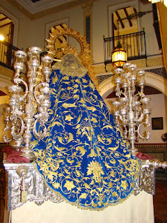 Manto procesional de Madre de Dios del Rosario . Patrona de Capataces y Costaleros. Bordado por Sobrinos de Caro en 1968.