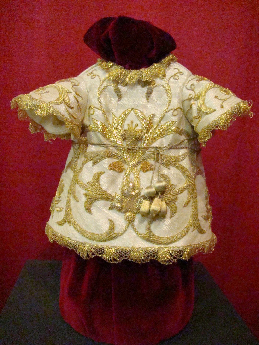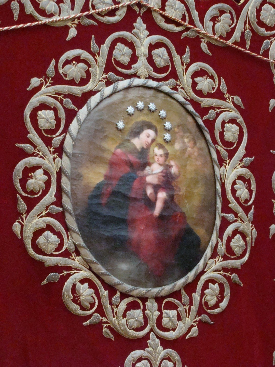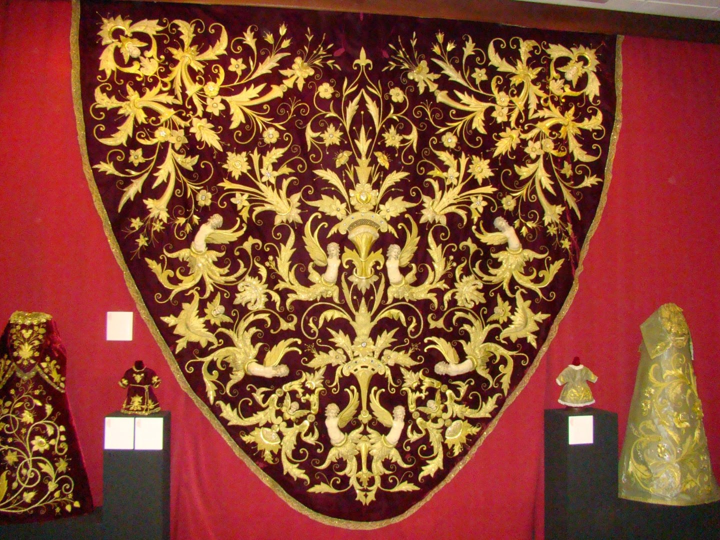 En la exposición se mostraron los diversos enseres que posee la hermandad para la salida procesional y el ajuar de la Virgen. En esta primera entrega se muestran las piezas de bordado que usa la imagen, destacando sobre manera el manto rojo de salida obra diseñada y bordada por Pedro de la Rosa Fernández en 1999. Este mismo bordador es autor de otras sayas y ropas del niño Jesús. El manto blanco es obra de Patrocinio López realizado entre 1850 y 1870, restaurado y ampliado por las hermanas Ramas en este año de 2014. También merece destacar el Simpecado de gala obra de Patrocinio López en 1861-1866.