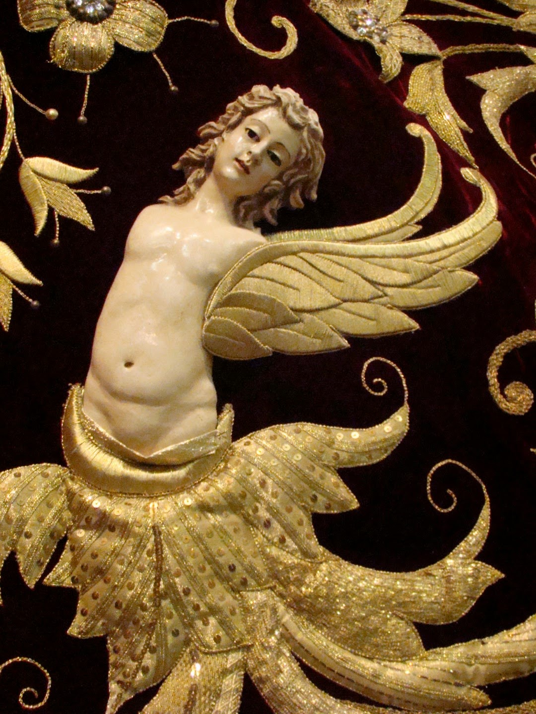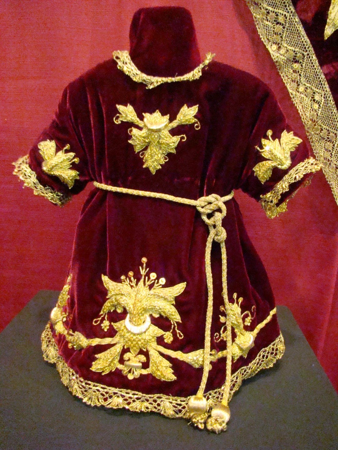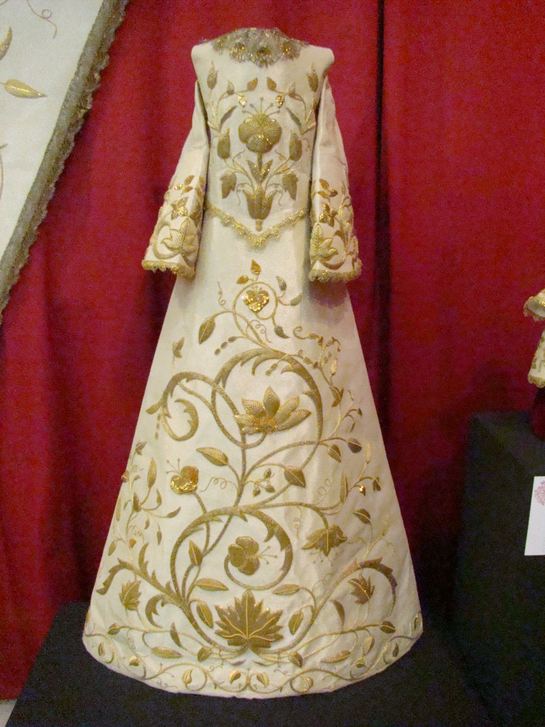 En la exposición se mostraron los diversos enseres que posee la hermandad para la salida procesional y el ajuar de la Virgen. En esta primera entrega se muestran las piezas de bordado que usa la imagen, destacando sobre manera el manto rojo de salida obra diseñada y bordada por Pedro de la Rosa Fernández en 1999. Este mismo bordador es autor de otras sayas y ropas del niño Jesús. El manto blanco es obra de Patrocinio López realizado entre 1850 y 1870, restaurado y ampliado por las hermanas Ramas en este año de 2014. También merece destacar el Simpecado de gala obra de Patrocinio López en 1861-1866.