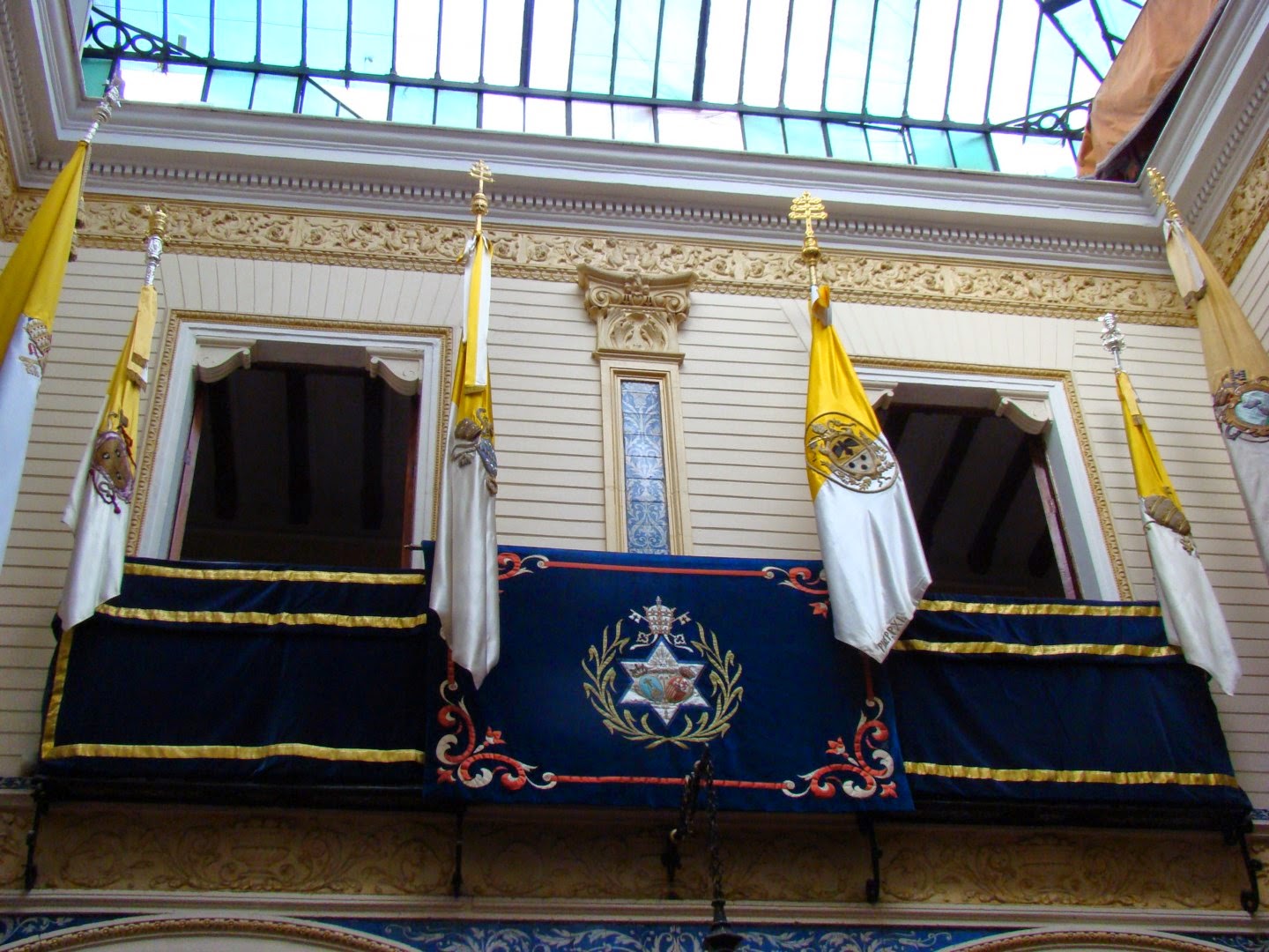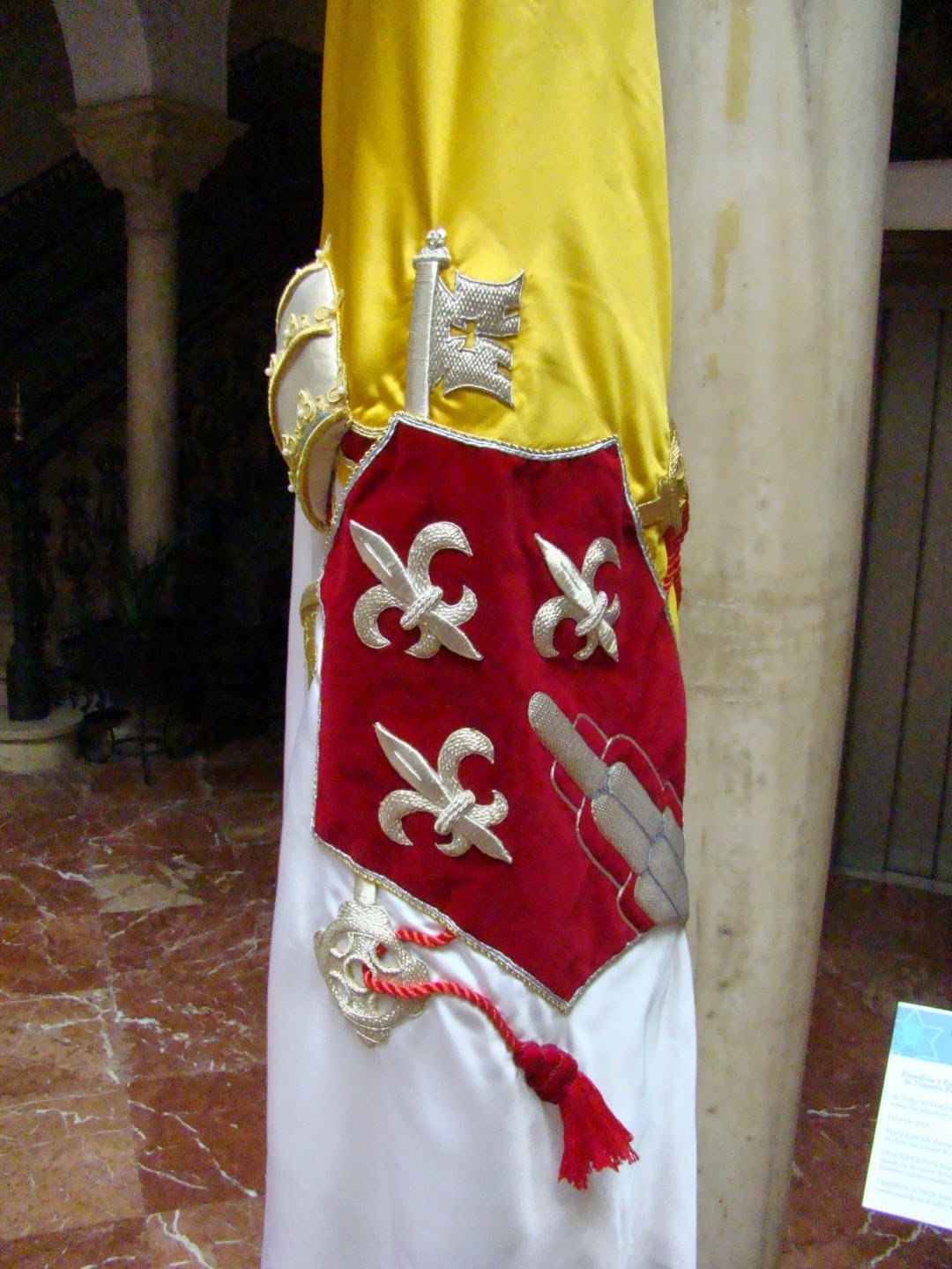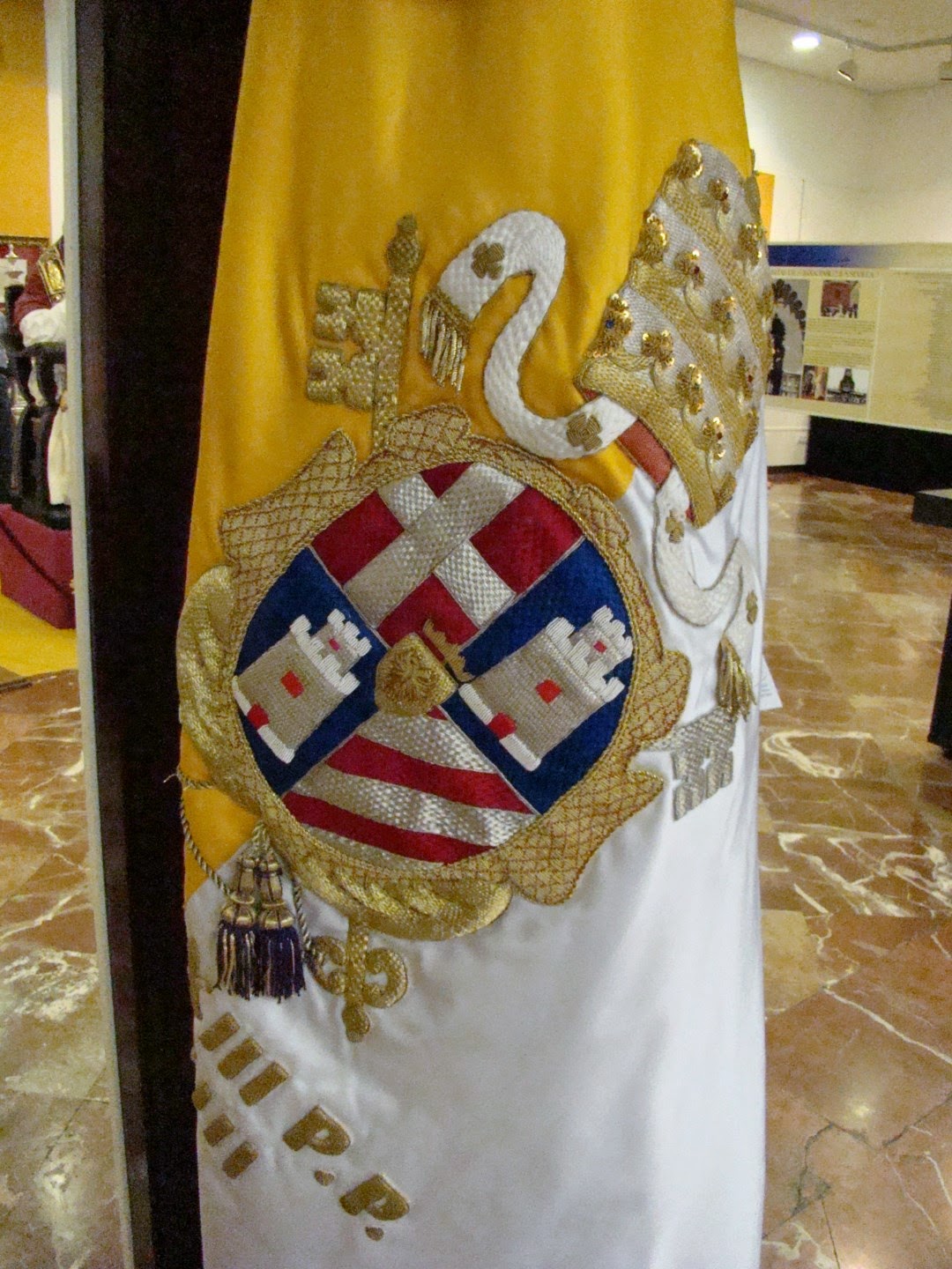 Con el título de Santo Padre, la huella del Pescador en Sevilla se instalo en la sede del Círculo Mercantil de Sevilla una exposición organizada por la Hermandad de la Estrella y con la colaboración de otras hermandades sevillanas, sobre todo las que poseen el título de “Pontificia” en homenaje a los dos Papas que han sido recientemente subidos a los altares como “Santos”. La muestra sobre S. Juan XXIII y S. Juan Pablo II, nos recuerdo sobre todo las visitas que hizo a nuestra ciudad este último. Les mostramos a continuación las banderas pontificias correspondientes a las hermandades de La Estrella, Gran Poder, Dulce Nombre, El Valle, Cachorro, San Benito, San Gonzalo, El Amor, La O y Esperanza de Triana, cada una de ellas con el escudo del Papa que les concedió dicho título.
