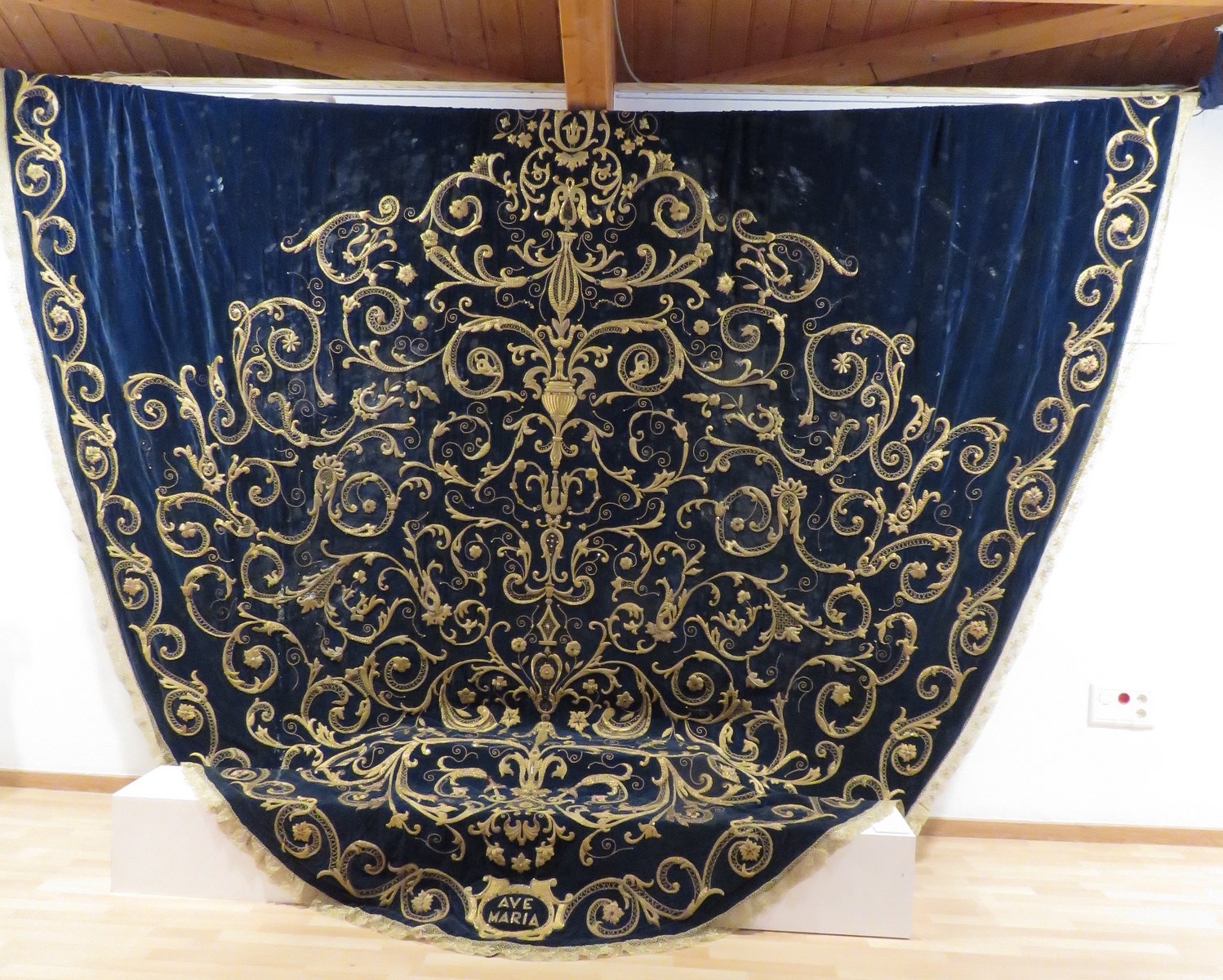 La Antigua , Fervorosa, Real e Ilustre Hermandad y Archicofradía del Santísimo Sacramento, Ánimas Benditas, Nº Padre Jesús Nazareno, María Santísima del Socorro y San Juan Evangelista,de la localidad sevillana de Alcalá de Guadaíra está conmemorando en el presente año el 75 aniversario de la hechura y Bendición de su dolorosa titular, obra del escultor D. Sebastián Santos. Entre los diversos actos celebrados ha destacado la realización de una exposición en el Museo de la localidad bajo el título de “ Socorro de la mañana” donde se han mostrado las diferentes piezas que componen el ajuar y patrimonio artístico de la sagrada imagen mariana atesorado a lo largo de los siglos, ya que aunque la imagen primitiva fue pasto de las llamas en la guerra civil algunos de sus enseres se conservaron. En esta segunda entrega les mostramos el antiguo manto de salida obra del taller de Padilla en 1964.
