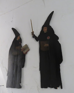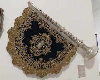 Bocinas, diseño de los paños Herminia Álvarez Udell, realizados en taller de Hijos de Miguel del Olmo en 1919, la orfebreria diseñada por Fernando García Corona y realizada por orfebrería Gisbert en 1925.